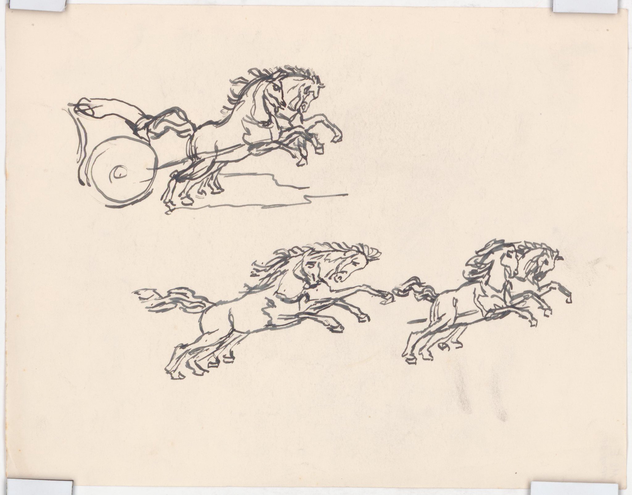 Esquisse pour des vitraux sur le thème de la "carte du ciel" : trois esquisses de chevaux deux par deux tirant un char.