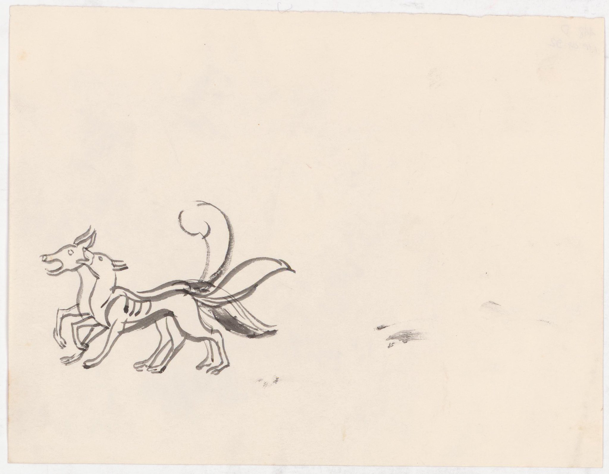 Esquisse pour des vitraux sur le thème de la "carte du ciel" : deux chiens (des lévriers pour la constellation du même nom ?) côte à côte.