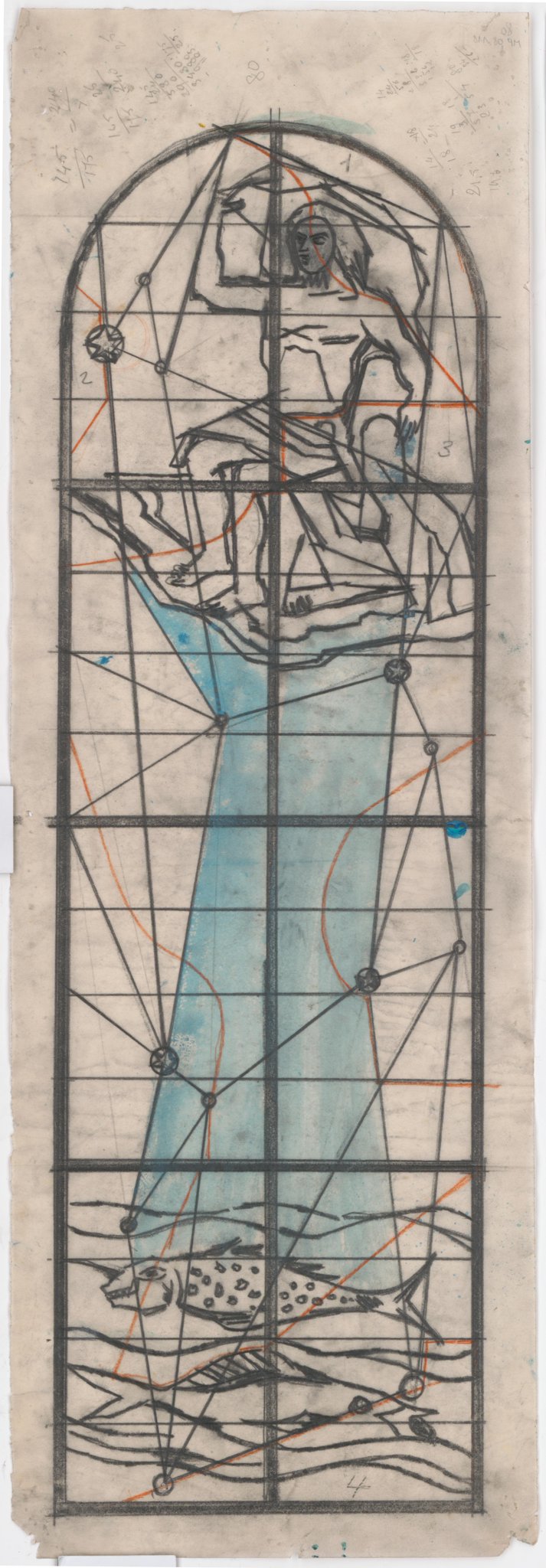 Projet pour des vitraux sur le thème de la "carte du ciel" avec deux signes du zodiaque à chaque extrémité. Les Poissons, l'un au-dessus de l'autre flottant dans l'eau en bas, et le Verseau assis en haut, tenant sa cruche sous le bras et levant l'autre au-dessus de sa tête. La composition est traversée par le tracé de leurs constellations sur un fond de ciel bleu.