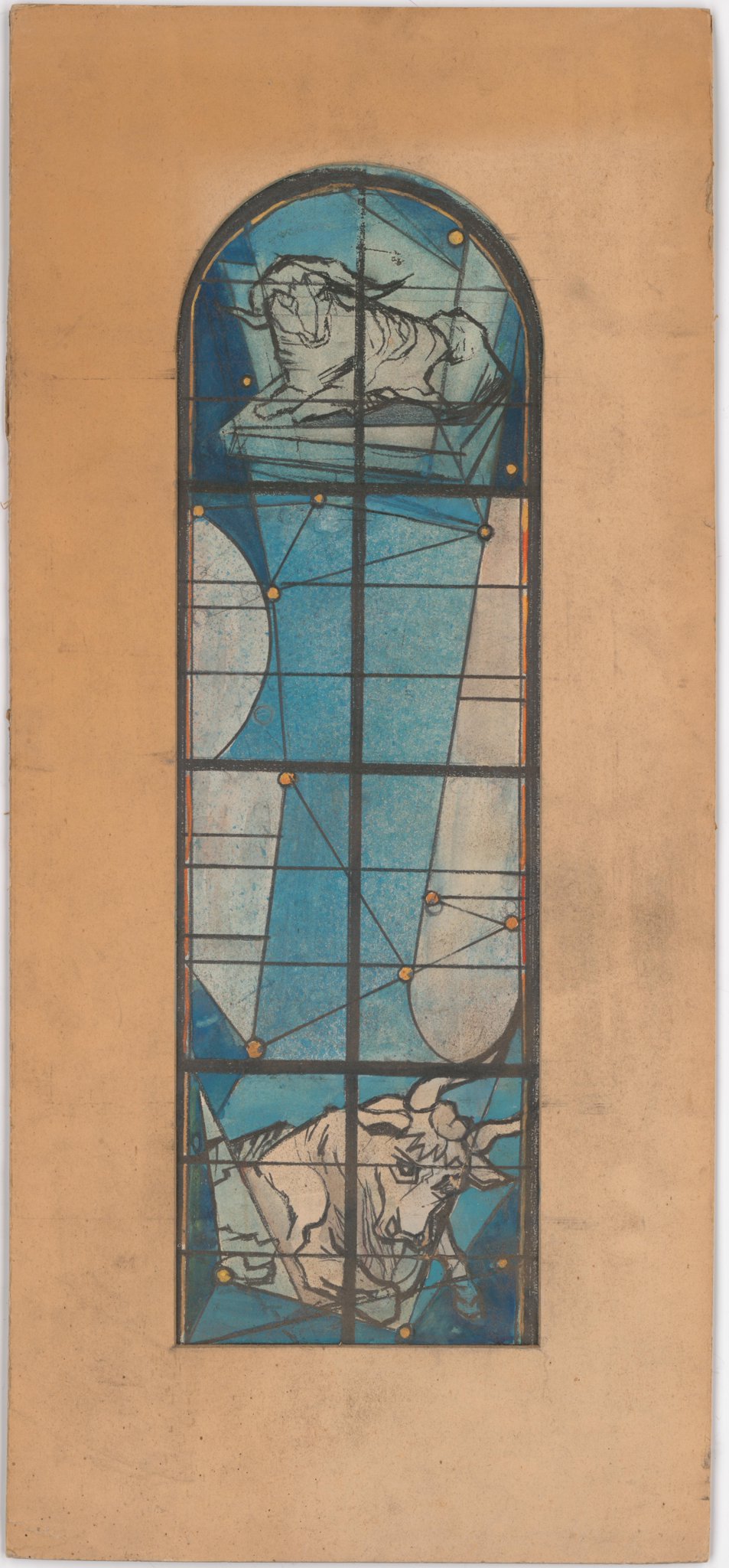 Maquette en couleur pour des vitraux sur le thème de la "carte du ciel" avec deux signes du zodiaque à chaque extrémité. Le Taureau, couché en bas, dont on ne voit que le buste, et le Bélier couché en haut sur une sorte de socle. La composition est traversée par le tracé de leurs constellations sur un fond de ciel bleu.
