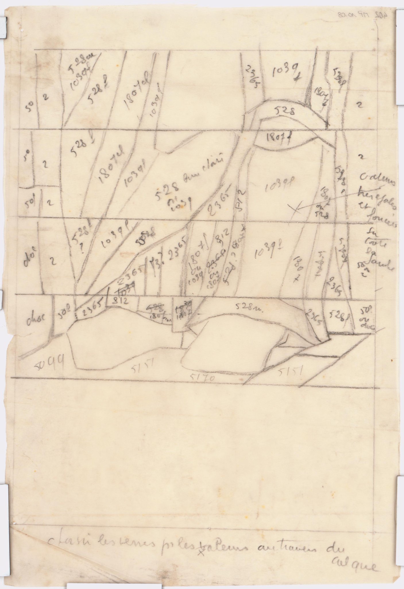 On peut supposer que cette esquisse correspond à une étape avancée de la conception du projet, puisque Poncet y définit déjà les codes couleurs pour les verres. Ce travail peut donc être daté entre 1943, date à laquelle il commence la conception de ces vitraux.