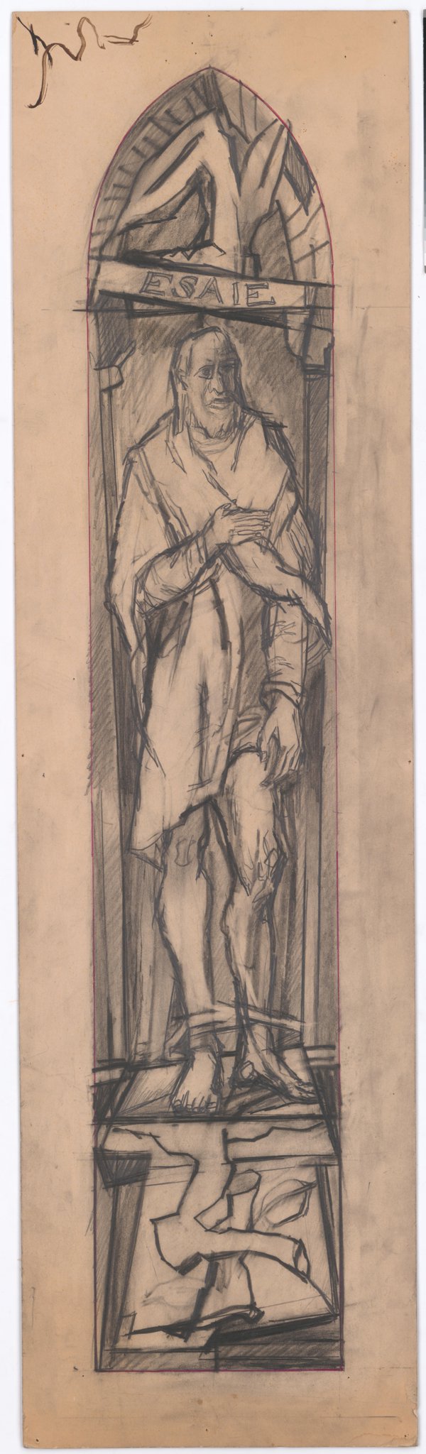 En automne 1949, le comité des vitraux de la collégiale de Neuchâtel s'adresse à Poncet afin qu'il se charge de compléter le programme de vitraux commencé par l'artiste Théodore Delachaux, décédé avant d'avoir pu achever son oeuvre. Il commence par concevoir les trois vitraux d'Esaïe, Jérémie et Ezéchiel, posés en décembre 1950. Les trois derniers vitraux; Daniel, Moïse et Jean-Baptiste; seront achevés au cours de l'année 1951 et posés également au mois de décembre. Tous sont financés en partie par de riches familles neuchâteloises, dont les armoiries figurent en dessous des personnages. La paroisse est également aidée par un nouveau subside de la fondation Gleyre, se montant à 1000 frs. Cette oeuvre, proche par bien des points des prophètes réalisés pour l'église de Saint-Sigismond à Saint-Maurice (VS) entre 1943 et 1946, semble appréciée du public, et constitue un second "succès" auprès du public protestant, après les vitraux du temple de Bassins en 1934, et près de trente ans après le scandale des quatre Evangélistes de la cathédrale de Lausanne (NOVERRAZ, 2014, pp. 89-96 ; REYMOND, 1992, pp. 79, 110 ; Dossier "Vitraux, collégiale de Neuchâtel, 1950-1951, correspondance officielle, 1949", boîte "VITRAUX II, 1948-1953", archives Poncet, Vitrocentre Romont).