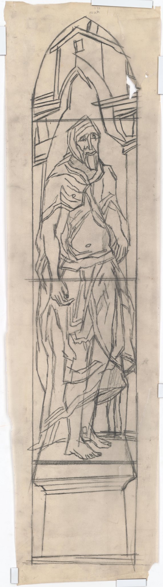 En automne 1949, le comité des vitraux de la collégiale de Neuchâtel s'adresse à Poncet afin qu'il se charge de compléter le programme de vitraux commencé par l'artiste Théodore Delachaux, décédé avant d'avoir pu achever son oeuvre. Il commence par concevoir les trois vitraux d'Esaïe, Jérémie et Ezéchiel, posés en décembre 1950. Les trois derniers vitraux; Daniel, Moïse et Jean-Baptiste; seront achevés au cours de l'année 1951 et posés également au mois de décembre. Tous sont financés en partie par de riches familles neuchâteloises, dont les armoiries figurent en dessous des personnages. La paroisse est également aidée par un nouveau subside de la fondation Gleyre, se montant à 1000 frs. Cette oeuvre, proche par bien des points des prophètes réalisés pour l'église de Saint-Sigismond à Saint-Maurice (VS) entre 1943 et 1946, semble appréciée du public, et constitue un second "succès" auprès du public protestant, après les vitraux du temple de Bassins en 1934, et près de trente ans après le scandale des quatre Evangélistes de la cathédrale de Lausanne (NOVERRAZ, 2014, pp. 89-96 ; REYMOND, 1992, pp. 79, 110 ; Dossier "Vitraux, collégiale de Neuchâtel, 1950-1951, correspondance officielle, 1949", boîte "VITRAUX II, 1948-1953", archives Poncet, Vitrocentre Romont).