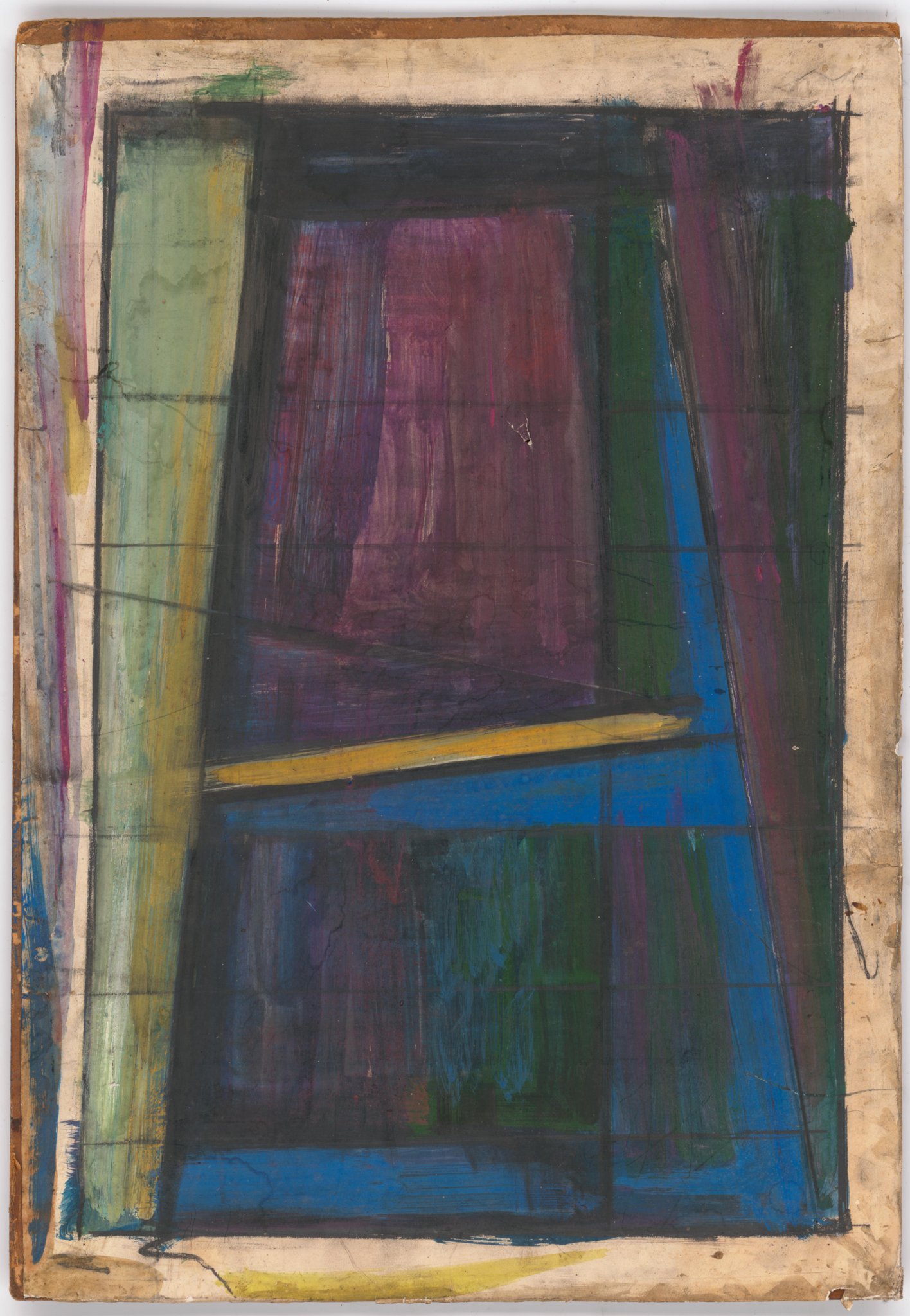Composition juxtaposant diverses plages colorées, dans des tons verts et mauves, traversées d'un réseau de lignes droites s'entrecoupant. Une grande ligne jaune verticale traverse le centre de la composition.