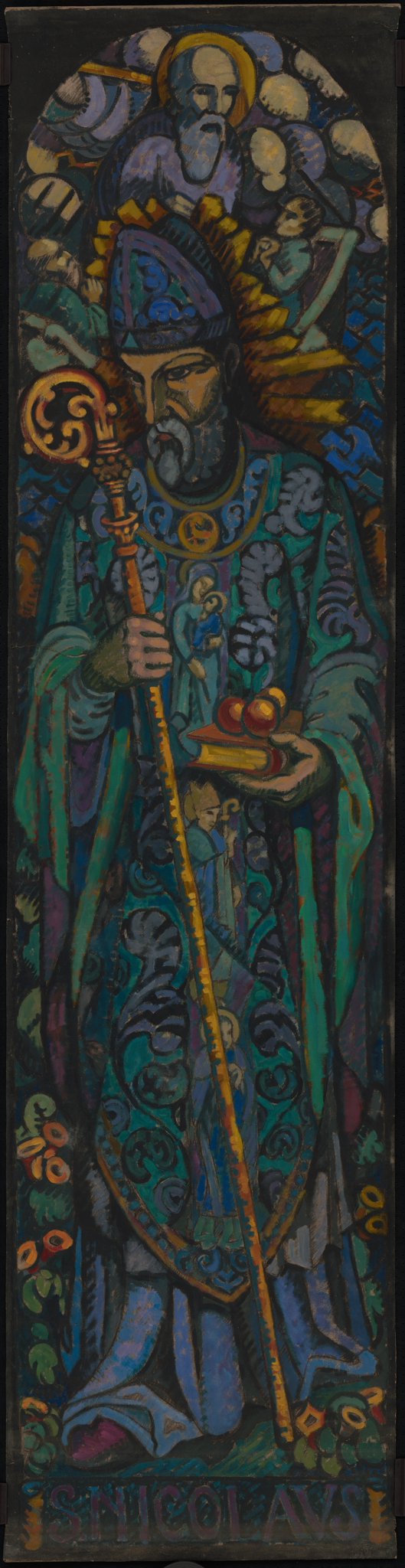 Poncet réalise deux maquettes pour le vitrail de saint Nicolas (MP_03.05 et MP_03.09) qui traduisent deux conceptions très différentes. Dans la première, MP_03.05 le saint occupe moins de place et l'aspect décoratif est très présent. La composition est également plus narrative et didactique, avec les trois petits enfants dans le saloir et le saint apparaissant une seconde fois dans la partie supérieure pour calmer la tempête. Poncet semble ensuite se tourner vers une composition moins narrative, où l'expressivité et le caractère du saint sont renforcés, tandis que le seul élément didactique, le saint calmant la tempête, est relégué au sommet du vitrail. C'est cette formule qui sera conservée dans les cartons définitifs (MP_03.12 et MP_03.18). Sur ce carton, Poncet définit également les couleurs du futur vitrail et les différents motifs qu'il traduira à la grisaille.