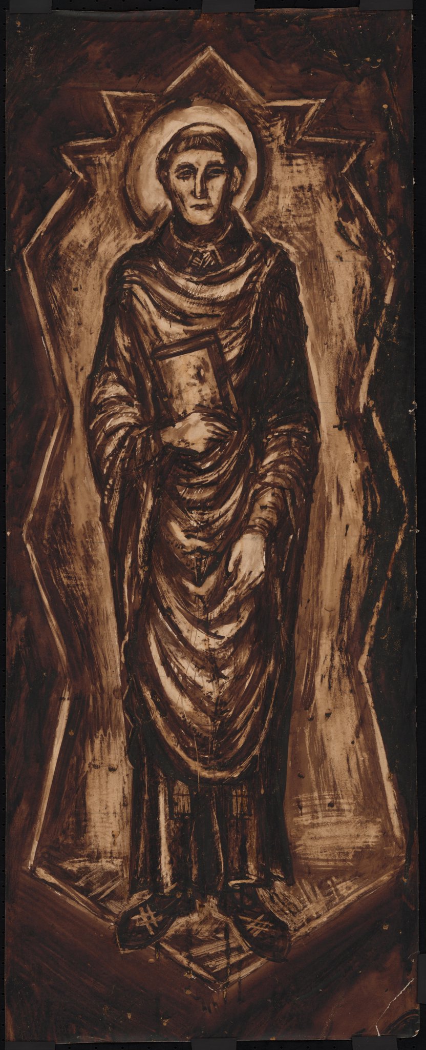 Poncet a réalisé un premier carton pour le vitrail de saint Etienne (MP_25.01) où le saint est beaucoup plus coloré et la figure plus hiératique que dans les projets suivants (MP_25.04 et MP_25.11), travaillés à la sépia, où Poncet confère une forte corporalité et personnalité au personnage. Sur les vitraux, la couleur est nuancée par une forte grisaille, et surtout présente dans les bordures très originales en pointes de diamant. Pour les deux vitraux du choeur, les figures de saint Pierre et Paul sont entièrement traitées en camaïeux de bruns noirs, sans couleur. Comme pour les vitraux de Gstaad, réalisés en 1932, Poncet semble donc glisser d'une première idée de verrières colorées au style plus conventionnel, à un résultat beaucoup plus sombre, où la technique de la sépia répond à la grisaille abondante des vitraux. Ces cartons fournissent donc de précieuses informations sur la réflexion de l'artiste pour la création de ce cycle.