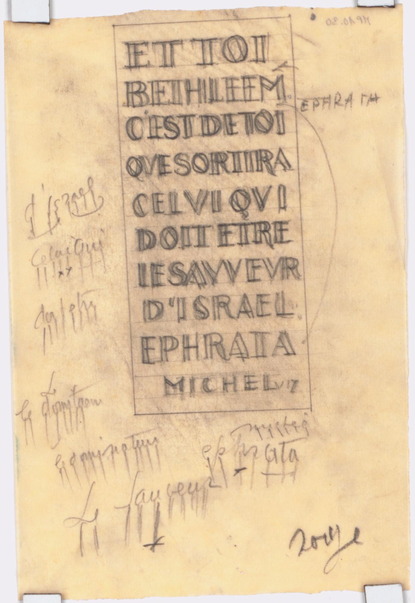[de haut en bas et de gauche à droite :] EPHRATA / d'Israel / celui qui / doit etre / le dominateur / le dominateur // michee / ephrata / Le Sauveur / [...]y