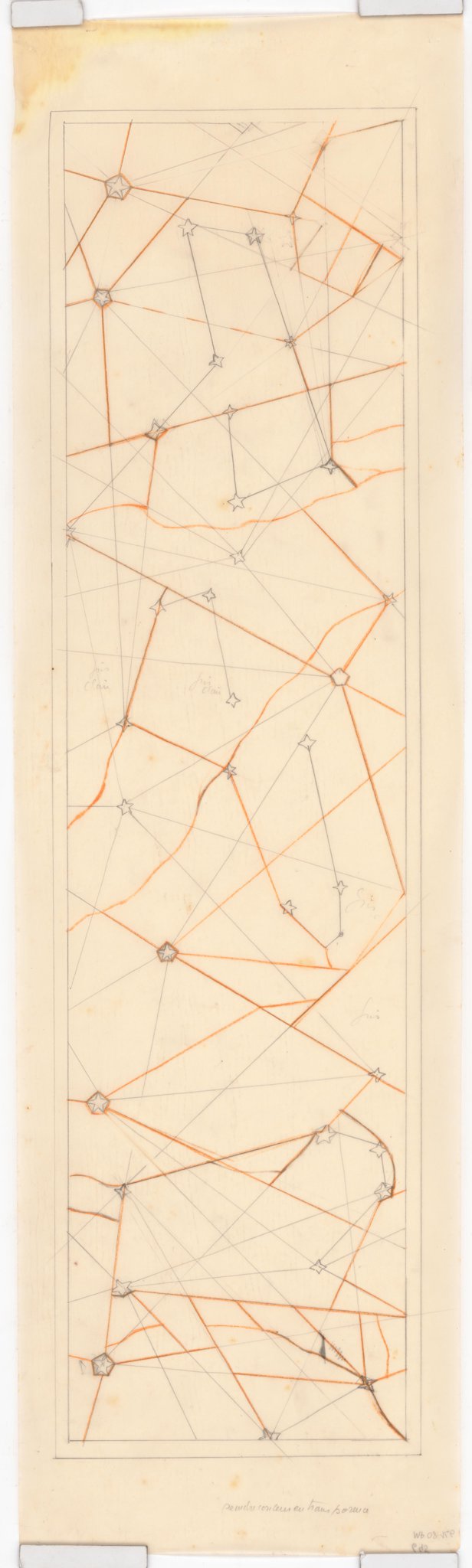Projet pour les vitraux sur le thème de la "carte du ciel": indications du tracé des plombs d'un futur vitrail et des codes couleurs, dont les contours définissent également le tracé des constellations marqués en couleur et parsemés d'étoiles.