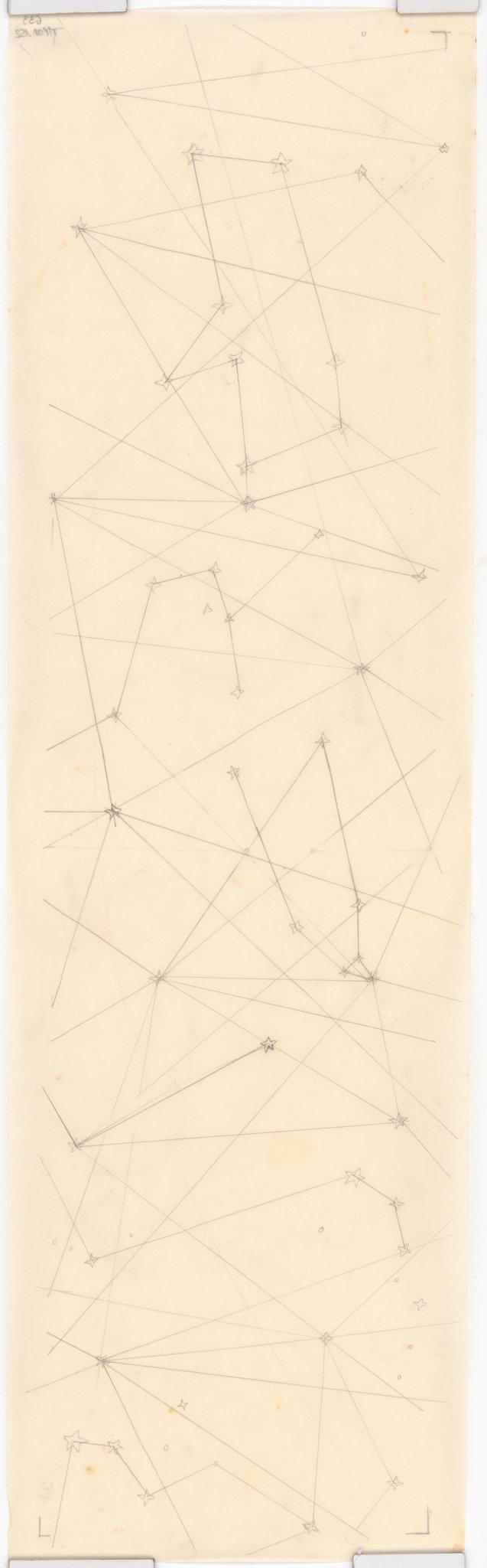 Projet pour les vitraux sur le thème de la "carte du ciel": tracés des constellations en lignes droites avec de petites étoiles aux intersections.
