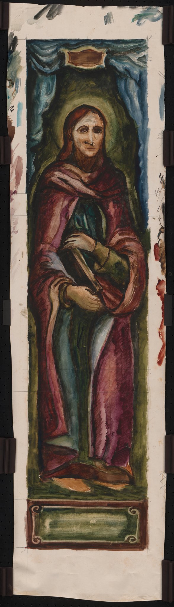 Ce travail préparatoire a été réalisé par Marcel Poncet dans le cadre de la commande de quatre vitraux des Evangélistes pour la Reformierte Kirche de Schlieren (Zurich), réalisés en 1937. Poncet obtient cette commande par l'intermédiaire de l'architecte de l'édifice, Walter Henauer (1880-1975), qu'il a rencontré à l'occasion de ses séjours parisiens. Suite à la pose des vitraux, il propose pour cette même église un projet de carte du ciel (représentations du zodiaque, des planètes et leurs personnifications), qui est refusé par la commission, pour des raisons avant tout financières (REYMOND, 1992, pp. 70, 170 ; "Neue reformierte Kirche in Zürich-Wollishofen und neue Kirche und Renovation der alten Kirche in Schlieren : Architekten W. Henauer & E. Witschi SA, Zürich.", 1938, pp. 297-304).