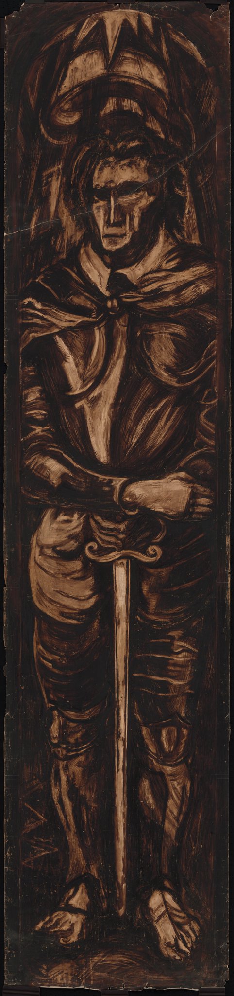 Saint Maurice en pied, vêtu en soldat, tenant une épée contre lui.