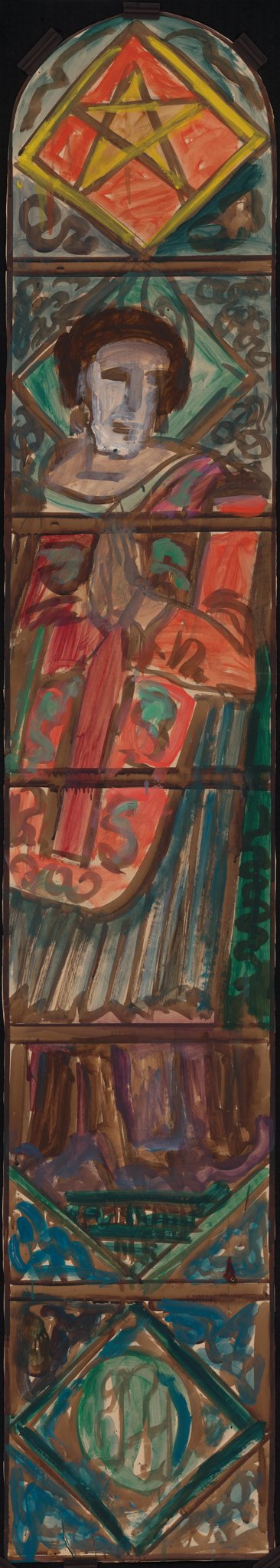 Ce carton fait probablement partie d'une série de cartons intermédiaires pour les vitraux de Gstaad. Il sont colorés et les saints sont représentés de manière plus traditionnelle que sur les cartons définitifs en camaïeu de gris et brun, correspondant aux vitraux, où Poncet confère aux saints une allure plus torturée et pathétique. On ignore cependant pourquoi Poncet modifie d'une manière aussi radicale son projet, d'autant qu'il ne semble pas en avoir averti les commanditaires, très choqués au moment de leur pose.