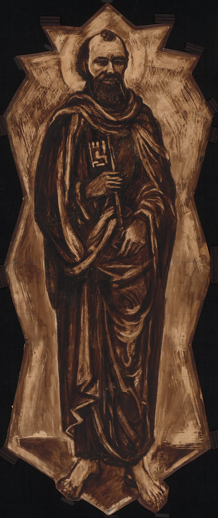 Ce carton a été réalisé par Marcel Poncet pour le vitrail de saint Pierre du choeur de l'église Saint-Maurice de Veyrier (GE).