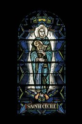 Ce carton a été réalisé par Marcel Poncet pour le vitrail de sainte Cécile de la nef de l'église Saint-Maurice de Veyrier (GE).