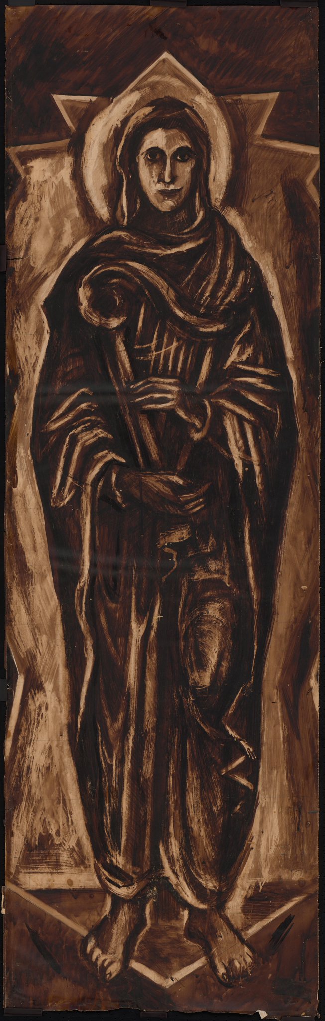 Un carton pour le vitrail de saint Etienne (MP_25.01) indique un changement de parti très intéressant pour les vitraux de ce cycle. Le saint y est beaucoup plus coloré et la figure plus hiératique que dans les projets suivants (MP_25.04 et MP_25.11), travaillés à la sépia, où Poncet confère une forte corporalité et personnalité au personnage. Les autres cartons du cycle, comme celui-ci, correspondent à cette seconde étape où l'artiste se concentre sur la définition du personnage en noir et blanc. Il réalise deux cartons presque identiques pour ce vitrail (MP_25.02 et MP_25.10), avec de légères variations dans le positionnement de la sainte. Sur les vitraux, la couleur est nuancée par une forte grisaille, et surtout présente dans les bordures très originales en pointes de diamant. Pour les deux vitraux du choeur, les figures de saint Pierre et Paul sont entièrement traitées en camaïeux de bruns noirs, sans couleur. Comme pour les vitraux de Gstaad, réalisés en 1932, Poncet semble donc glisser d'une première idée de verrières colorées au style plus conventionnel, à un résultat beaucoup plus sombre, où la technique de la sépia répond à la grisaille abondante des vitraux.