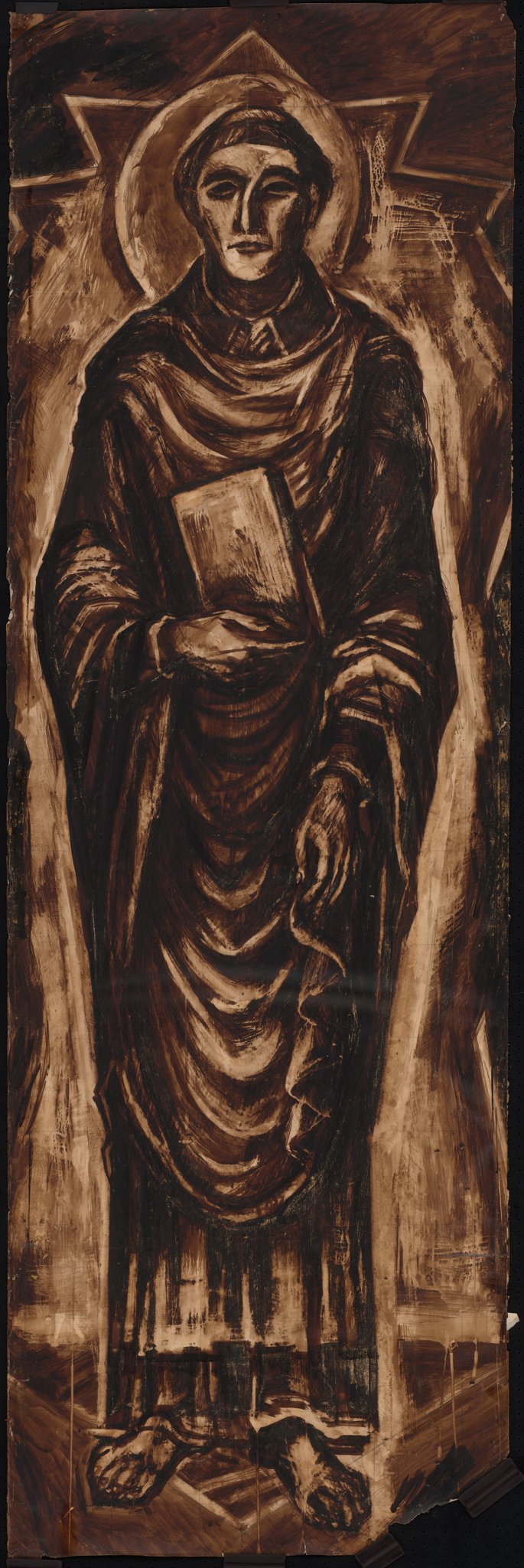 Poncet a réalisé un premier carton pour le vitrail de saint Etienne (MP_25.01) où le saint est beaucoup plus coloré et la figure plus hiératique que dans les projets suivants (MP_25.04 et MP_25.11), travaillés à la sépia, où Poncet confère une forte corporalité et personnalité au personnage. Sur les vitraux, la couleur est nuancée par une forte grisaille, et surtout présente dans les bordures très originales en pointes de diamant. Pour les deux vitraux du choeur, les figures de saint Pierre et Paul sont entièrement traitées en camaïeux de bruns noirs, sans couleur. Comme pour les vitraux de Gstaad, réalisés en 1932, Poncet semble donc glisser d'une première idée de verrières colorées au style plus conventionnel, à un résultat beaucoup plus sombre, où la technique de la sépia répond à la grisaille abondante des vitraux. Ces cartons fournissent donc de précieuses informations sur la réflexion de l'artiste pour la création de ce cycle.