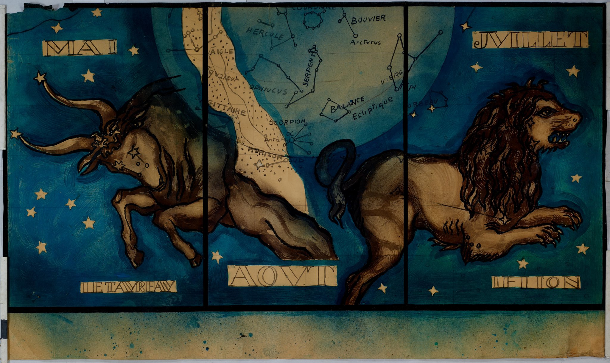 Projet en couleur pour les vitraux sur le thème de la "carte du ciel" : les personnifications des signes du Taureau, à gauche, et du Lion, à droite, autour d'un cercle central comprenant les constellations, (dont seule la moitié inférieure est dessinée ici, l'ensemble est complété par MP 08.171). Au verso : projet pour les vitraux sur le thème de la "carte du ciel" des Pressoirs du Roy de Fontainebleau (non réalisés): les personnifications des signes du Capricorne, représenté avec une queue de poisson, à gauche, et du Bélier, à droite, autour d'un cercle central, (dont seule la moitié inférieure est représentée ici). En haut à droite, on aperçoit la moitié inférieure de la personnification du signe des Poissons et du ruban qui les lie (l'ensemble est complété par le verso du MP 08.171).