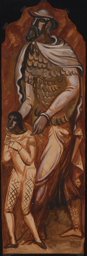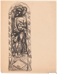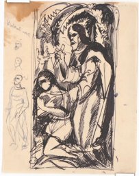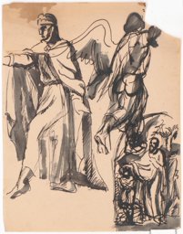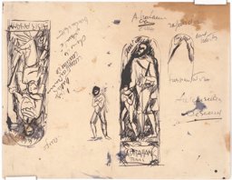 L'analyse du fonds graphique indique que l'artiste commence par réfléchir à sa composition en s'inspirant de différentes sources visuelles, à l'instar des ballets russes et Don Quichotte, comme le révèlent les notes accompagnant une des esquisses (MP_01.50). Il envisage trois partis très différents pour son vitrail. Dans le premier, il conçoit sa composition comme une scène narrative illustrant le sacrifice d'Isaac, comme on le constate sur trois esquisses (MP_01.54 ; MP_01.51 ; MP_01.55). Une deuxième version montre une représentation plus hiératique du prophète accompagné de son fils, au sein d'un encadrement architectural similaire aux autres vitraux, visible sur deux esquisses (MP_01.63 ; MP_01.58), et sur la maquette (MP_01.68). Enfin, il imagine un Abraham en costume de Don Quichotte, poussant devant lui son fils habillé lui aussi à la mode du XVIIème siècle, solution originale que l'on retrouve sur certaines esquisses (MP_01.50 ; MP_01.56 ; MP_01.57), ainsi que sur ce carton. Il est toutefois difficile de savoir laquelle de ces trois solutions a été retenue, en supposant que le vitrail a bien été réalisé. Les dimensions de ce carton correspondent quoi qu'il en soit à celles des cartons de David et Melchisedech, ce qui suggère que cette variante a été poussée jusqu'à une étape avancée du processus créatif.
