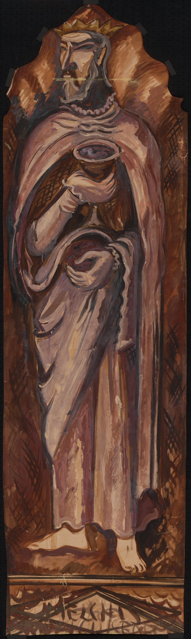 Carton en couleur pour le vitrail de Melchisedech : Melchisedech debout en pied, barbu et couronné, vêtu d'une grande cape tombant jusqu'à ses pieds, et tenant devant lui un calice. Il se tient sur un socle avec un cartouche contenant son nom dans un losange. La forme de l'arc polylobé entourant le saint est seulement esquissée.