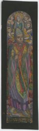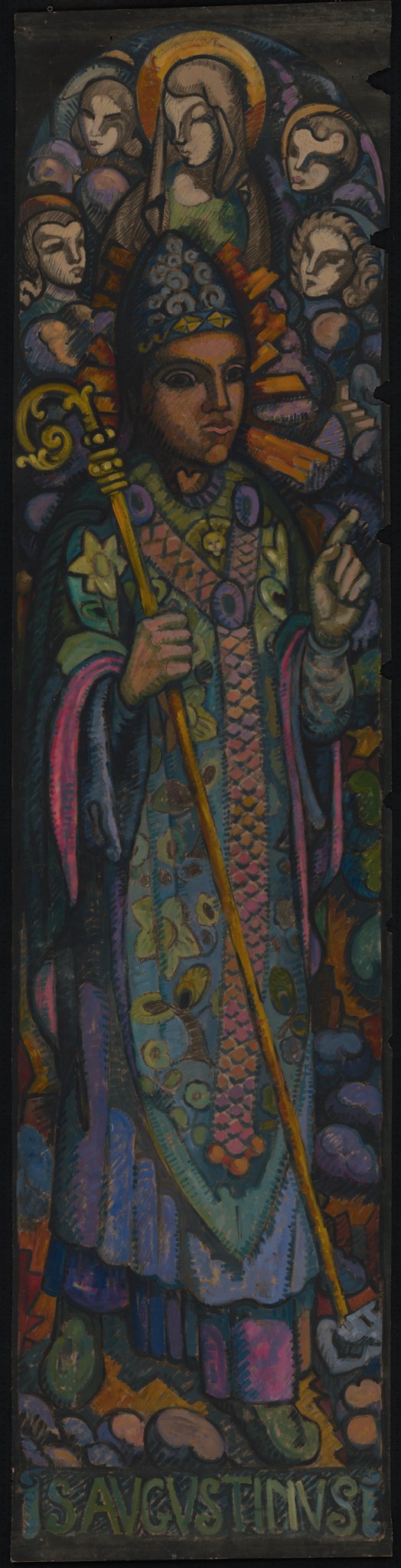 Il s'agit d'un carton en couleur pour le vitrail de saint Augustin. Poncet réalise deux maquettes pour le vitrail de saint Augustin (MP_03.04 et MP_03.07) qui traduisent deux conceptions très différentes. Dans la première, MP_03.04 le saint occupe moins de place et l'aspect décoratif est très présent. La composition est également plus narrative et didactique, avec le Christ en croix dans le fond et les trois anges dans les nuages. Poncet semble ensuite se tourner vers une solution moins narrative, où l'expressivité et le caractère du saint sont renforcés, tandis que le seul élément didactique, la mère du saint apparaissant entourée d'anges, est relégué au sommet du vitrail. C'est cette formule qui est visible dans les cartons définitifs comme celui-ci (MP_03.11 et MP_03.16).