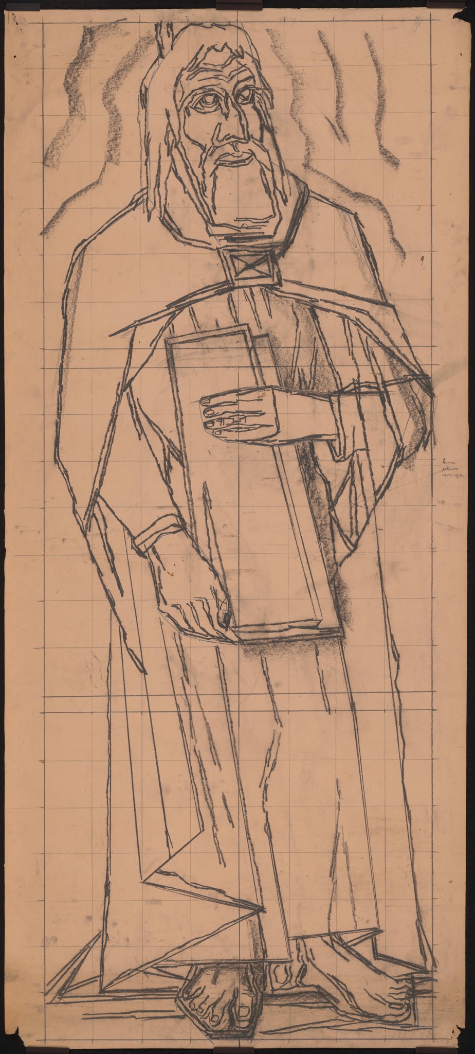 Ce travail préparatoire a été réalisé dans le cadre d'une commande de vitraux pour l'église Saint-Sigismond de Saint-Maurice en Valais. L'église ayant besoin d'être restaurée, le chanoine Louis Poncet propose à son frère de se charger de la réalisation de nouveaux vitraux, afin de remplacer les anciennes verrières du XIXème. La Paroisse disposant de peu de moyens, Marcel Poncet obtient un subside de la fondation Gleyre pour la réalisation de huit vitraux sur le thème des Prophètes. Les quatre premiers vitraux sont posés au cours de l'année 1944, et reçoivent des échos très positifs dans la presse. Les quatre derniers sont réalisés au cours de l'année 1946, et inaugurés en juin 1947. En 1960, les vitraux, alors jugés trop sombres pour la nef, ont été déplacés dans le choeur, superposés les uns au-dessus des autres. Ceux-ci n'ont retrouvé leur emplacement d'origine qu'en 2001, grâce à l'entremise de Jean-Pierre Coutaz, auteur des vitraux actuels du choeur. Ces oeuvres, qui jouent à la fois sur d'audacieux jeux de couleur et une grisaille abondante, semblent condenser les expériences antérieures de Marcel Poncet dans un nouvel équilibre entre ses métiers de peintre et de verrier. Les vitraux de Saint-Sigismond figurent, avec ceux de Saint-Paul de Grange-Canal et les quatre Evangélistes de la cathédrale de Lausanne, parmi ses réalisations les plus célèbres (NOVERRAZ, 2014, pp. 80-88 ; REYMOND, 1992, pp. 79, 108-112, 173-175 ; Dossier "Vitraux, Eglise Saint-Sigismond, Saint-Maurice, 1941-1947", boîte "VITRAUX II, 1932-1947", fonds Poncet, Vitrocentre Romont).