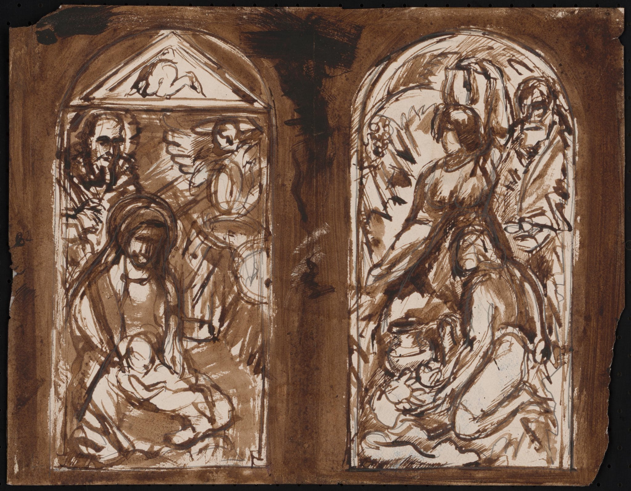 Dans la lancette de gauche, la Vierge est penchée au-dessus de l'enfant couché dans la crèche, accompagnée de Joseph à gauche, avec l'ange apparaissant en tenant un médaillon en haut à droite. Dans la lancette de droite, trois personnages offrant des présents au Christ, celui au premier plan agenouillé et tendant une cruche, une femme au deuxième plan portant une cruche sur sa tête, et un troisième homme debout à droite.