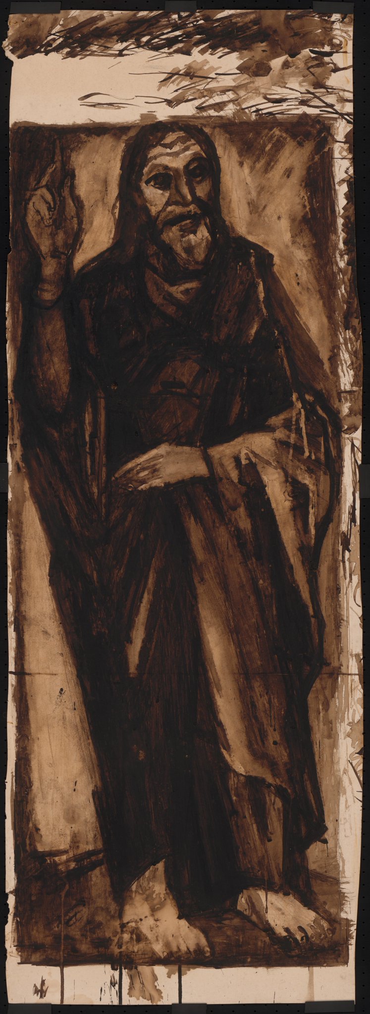 Ce travail préparatoire a été réalisé dans le cadre d'une commande de vitraux pour l'église Saint-Sigismond de Saint-Maurice en Valais. L'église ayant besoin d'être restaurée, le chanoine Louis Poncet propose à son frère de se charger de la réalisation de nouveaux vitraux, afin de remplacer les anciennes verrières du XIXème. La Paroisse disposant de peu de moyens, Marcel Poncet obtient un subside de la fondation Gleyre pour la réalisation de huit vitraux sur le thème des Prophètes. Les quatre premiers vitraux sont posés au cours de l'année 1944, et reçoivent des échos très positifs dans la presse. Les quatre derniers sont réalisés au cours de l'année 1946, et inaugurés en juin 1947. En 1960, les vitraux, alors jugés trop sombres pour la nef, ont été déplacés dans le choeur, superposés les uns au-dessus des autres. Ceux-ci n'ont retrouvé leur emplacement d'origine qu'en 2001, grâce à l'entremise de Jean-Pierre Coutaz, auteur des vitraux actuels du choeur. Ces oeuvres, qui jouent à la fois sur d'audacieux jeux de couleur et une grisaille abondante, semblent condenser les expériences antérieures de Marcel Poncet dans un nouvel équilibre entre ses métiers de peintre et de verrier. Les vitraux de Saint-Sigismond figurent, avec ceux de Saint-Paul de Grange-Canal et les quatre Evangélistes de la cathédrale de Lausanne, parmi ses réalisations les plus célèbres (NOVERRAZ, 2014, pp. 80-88 ; REYMOND, 1992, pp. 79, 108-112, 173-175 ; Dossier "Vitraux, Eglise Saint-Sigismond, Saint-Maurice, 1941-1947", boîte "VITRAUX II, 1932-1947", fonds Poncet, Vitrocentre Romont).