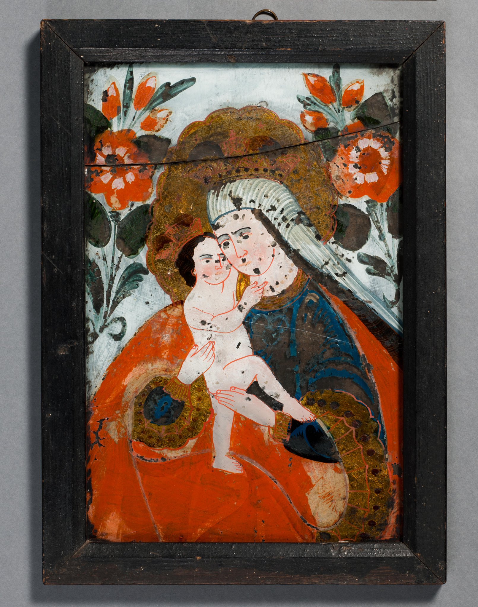 Die gekrönte Muttergottes drückt das nackte, ebenfalls gekrönte Jesuskind mit beiden Armen an ihre Wange. Sie trägt über einem blauen Kleid mit verziertem Kragen und verzierten Ärmelsäumen einen roten Mantel. Ein langer grau-weisser Schleier bedeckt ihr langes Haar. Kronen, Kragen, Ärmelsäume und Nimben sind mit Bronzepulver gemalt. Rote Blumen auf milchig-weissem Grund zieren die oberen Bildecken.