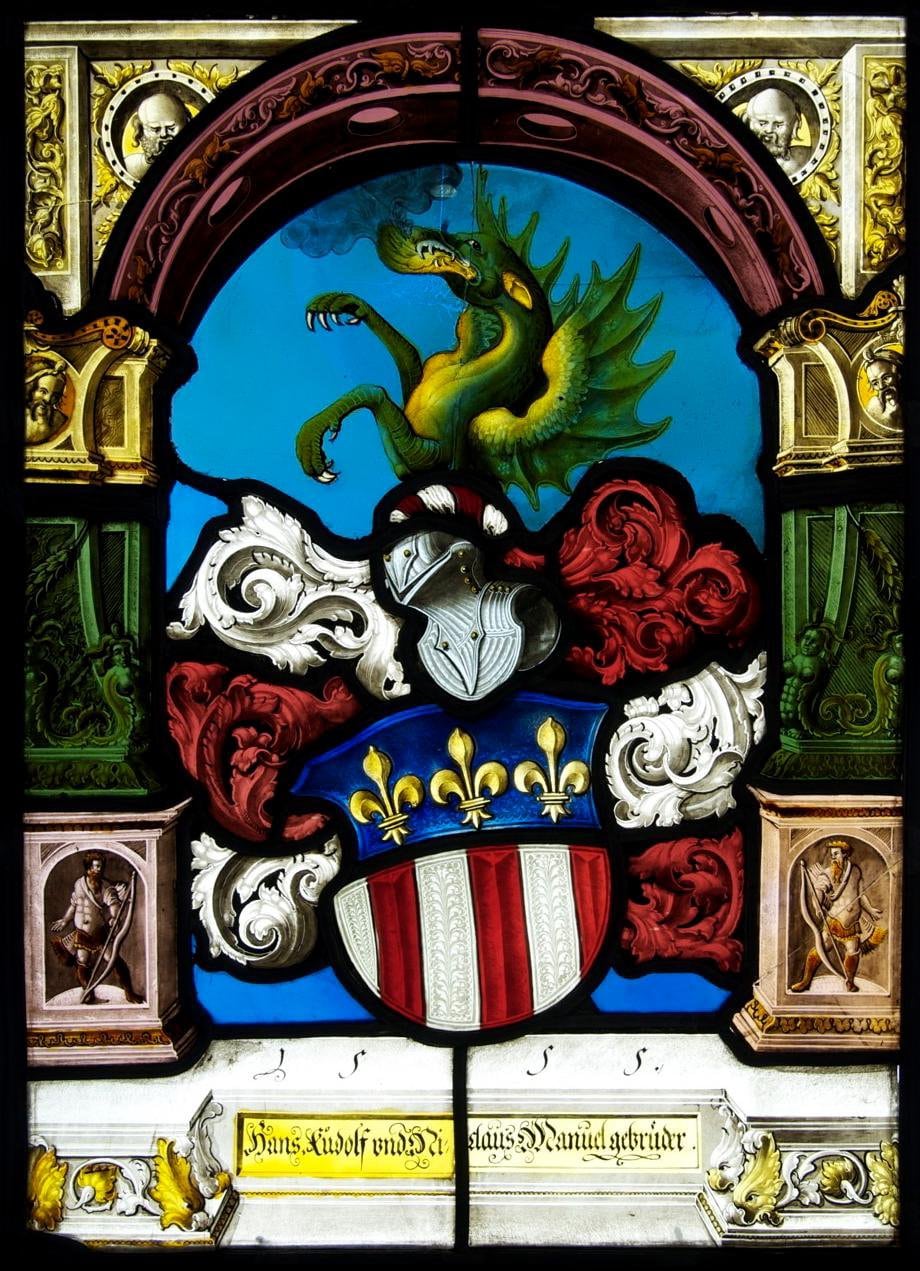 Über dem Podium mit der Stifterinschrift ist das Vollwappen der Brüder Niklaus II. und Hans Rudolf Manuel vor himmelblauen Grund gesetzt. Der Wappenschild mit seiner kunstvoll gestalteten Helmdecke und dem prächtigen, furchterregend fauchenden Drachen der Helmzier umfasst eine Renaissance-Arkade mit reichem Figurenschmuck: die Oberbilderzwickel und Kapitelle nehmen Tondi mit Männerbüsten auf, die Basen der rahmenden Pfeiler zeigen in Nischen stehende Bogenschützen.