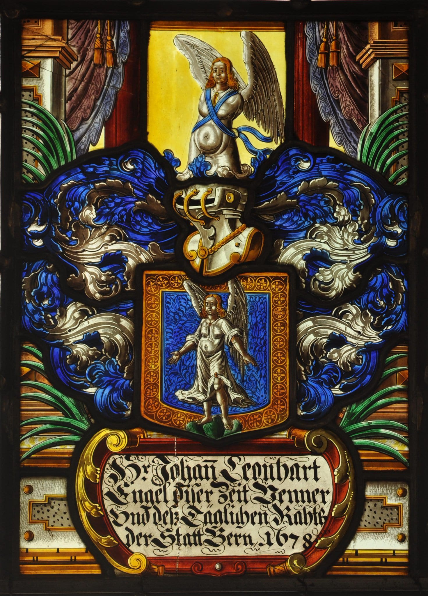 Den Riss zu einer Allianzwappenscheibe Engels und dessen zwei Frauen fertigte 1662 Hans Ulrich II. Fisch (Hasler 1996/97, Bd. 1, Kat.-Nr. 76). Wappenscheiben Engels haben sich in den Kirchen von Hasle bei Burgdorf (1678), Erlach (1678), Nidau (1680) und Steffisburg (1681) erhalten. Verschollen sind die vormals in den Kirchen von Wohlen (1678) und Kirchdorf (1679) vorhandenen Glasgemälde (Thormann/von Mülinen 1896, S. 72, 95). Zudem bewahrt das Museum für Kunst und Geschichte in Freiburg i. Ü. eine Wappenscheibe Engels von 1676 (Bergmann 2014, Bd. 2, Kat.-Nr. 160). Drei weitere Wappenscheiben des Stifters aus den Jahren 1678, 1679 und 1680 befinden sich im Besitz des Bernischen Historischen Museums (BHM Bern, Inv. 397, 63460, 1907). Verschollen ist ein Glasgemälde Engels aus dem Jahre 1681 (ehemals im Basler Kunsthandel; BHM Bern, Foto 4131). Vielleicht ist dasselbe mit der Wappenstiftung identisch, die Engel als Seckelmeister um 1681 in die Kirche oder Landvogtei von Gottstatt (Orpund) machte. Der Staatsmann Johann Leonhard Engel war demnach ein freudiger Spender von Wappenscheiben, die meist nur in wenigen Details voneinander abweichen und mehrheitlich in der Berner Werkstatt Güders in Auftrag gegeben wurden.