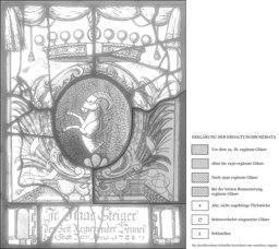 Innerhalb eines schlichten Rahmens mit gerafftem Vorhang als oberen Abschluss steht vor blauem Grund das Wappen Isaak Steigers auf einem teppichgeschmückten Podestaufsatz. Es prangt vor dem blauen Grund in einer von Palmblättern durchsteckten Rollwerkkartusche und wird von einer Rangkrone mit neun Kugeln überhöht. Vor der Front des durchbrochenen Podestes ist eine schlichte Tafel mit der Stifterinschrift angebracht.