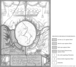 Die Inschriftentafel und der Palmwedel links mit dem Podium darunter neu ergänzt; ein Sprung und zahlreiche Sprungbleie; die Verbleiung erneuert.
