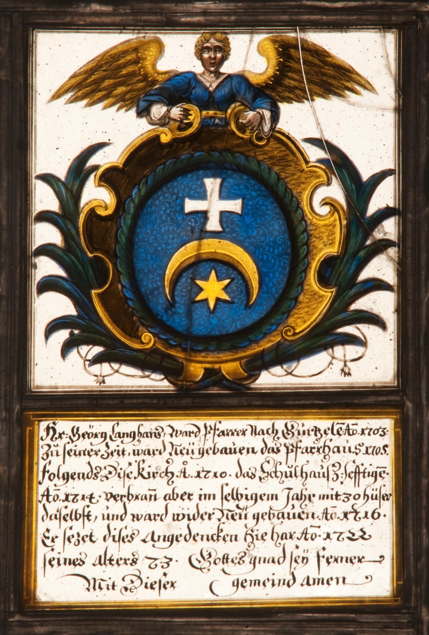 Hr: Geörg Langhans, ward Pfarrer Nach Gurtzele Ao 1703 / Zů seiner Zeit ward Neü gebauen das Pfarrhaus 1705. / Folgends Dise Kirch Ao 1710. das Schulhauβ Z: Sefftige. / Ao 1714. verbran aber im selbigem Jahr mit 30 hüser / daselbst, und ward wider Neü gebauen Ao 1716. / Ersezet dises Angedencken hie har Ao 1722 / seines Alters 73. Gottes gnad seÿ ferner / Mit Dieser gemeind Amen.