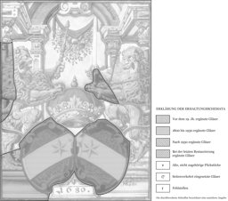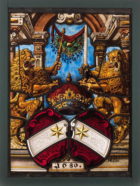 Die beiden ergänzten, von einer Krone überhöhten Rollwerkschilde mit dem Stadtwappen Thuns begleiten zwei Löwen, die in ihren Vorderpranken die Krone bzw. Zepter und Schwert halten. Als Standplatz dient den Löwen das Podium am Scheibenfuss, auf dessen vorkragendem zentralem Teil die Jahreszahl steht. Hinter den Löwen erhebt sich vor blauem Grund eine dreiachsige, perspektivisch verkürzte Architektur. Die schmalen Seitenöffnungen werden oben durch ein zurückfluchtendes Gebälk abgeschlossen. Über den inneren Pilastern erhebt sich ein grosser zentraler Bogen, an dem ein rotes Tuch mit einem Frucht- und Blattgehänge aufgehängt ist.