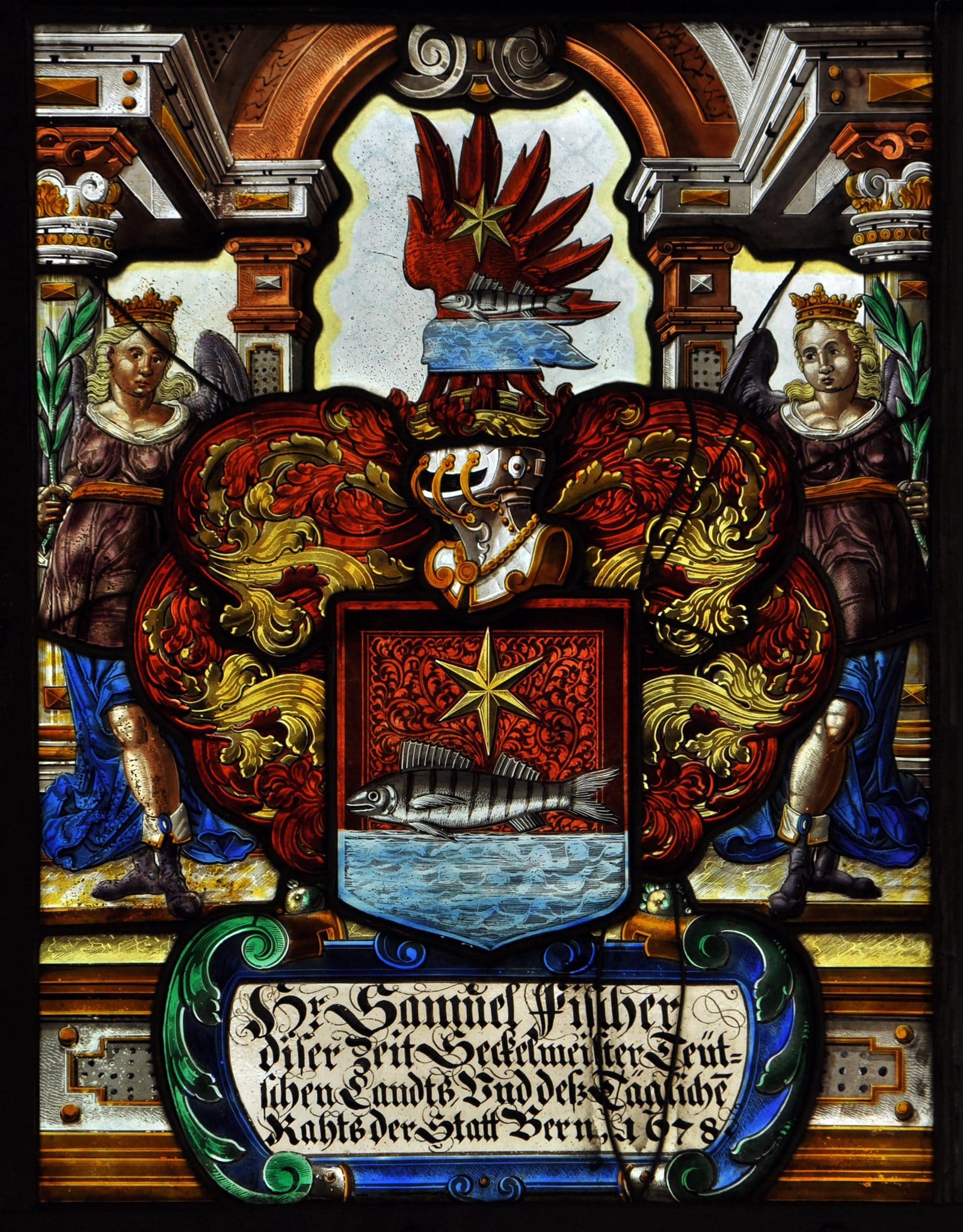 Das Vollwappen Samuel Fischers erhebt sich über der Rollwerkkartusche mit der Stifterinschrift. Begleitet wird es von zwei auf dem Podium stehenden bekrönten Engeln in blauen Röcken und violetten Tuniken. Die Palmwedel, die beide in der Hand halten, weisen sie möglicherweise als Allegorien des Friedens aus. Hinter Figuren und Wappen erhebt sich vor farblosem Grund eine in Grisaille- und Silbergelbmalerei ausgeführte Hallenarchitektur. Sie besteht aus zwei runden Aussenpfeilern, die ein perspektivisch verkürztes Gebälk mit der zentralen, von einem Rundbogen bekrönten Arkade verbindet.