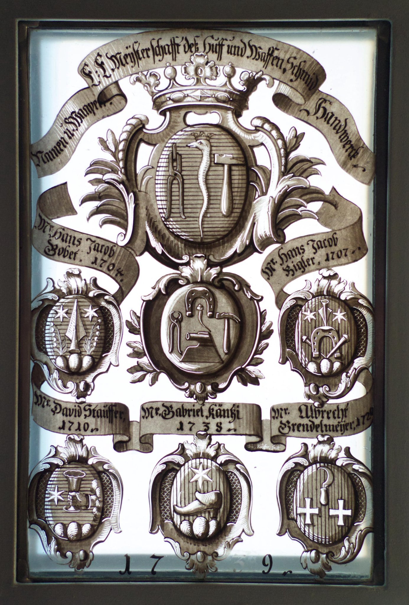 Namen u. Waapen E: E: Meÿsterschafft deβ Huff und Waffen Schmid Handwerck / Mr. Hans Jacob Gobet. 1704. / Mr. David Stauffer 1710 / Mr. Gabriel Käntzi 1738 / Mr. Albrecht Grendelmeÿer 1729 / Mr. Hans Jacob Bigler 1707.