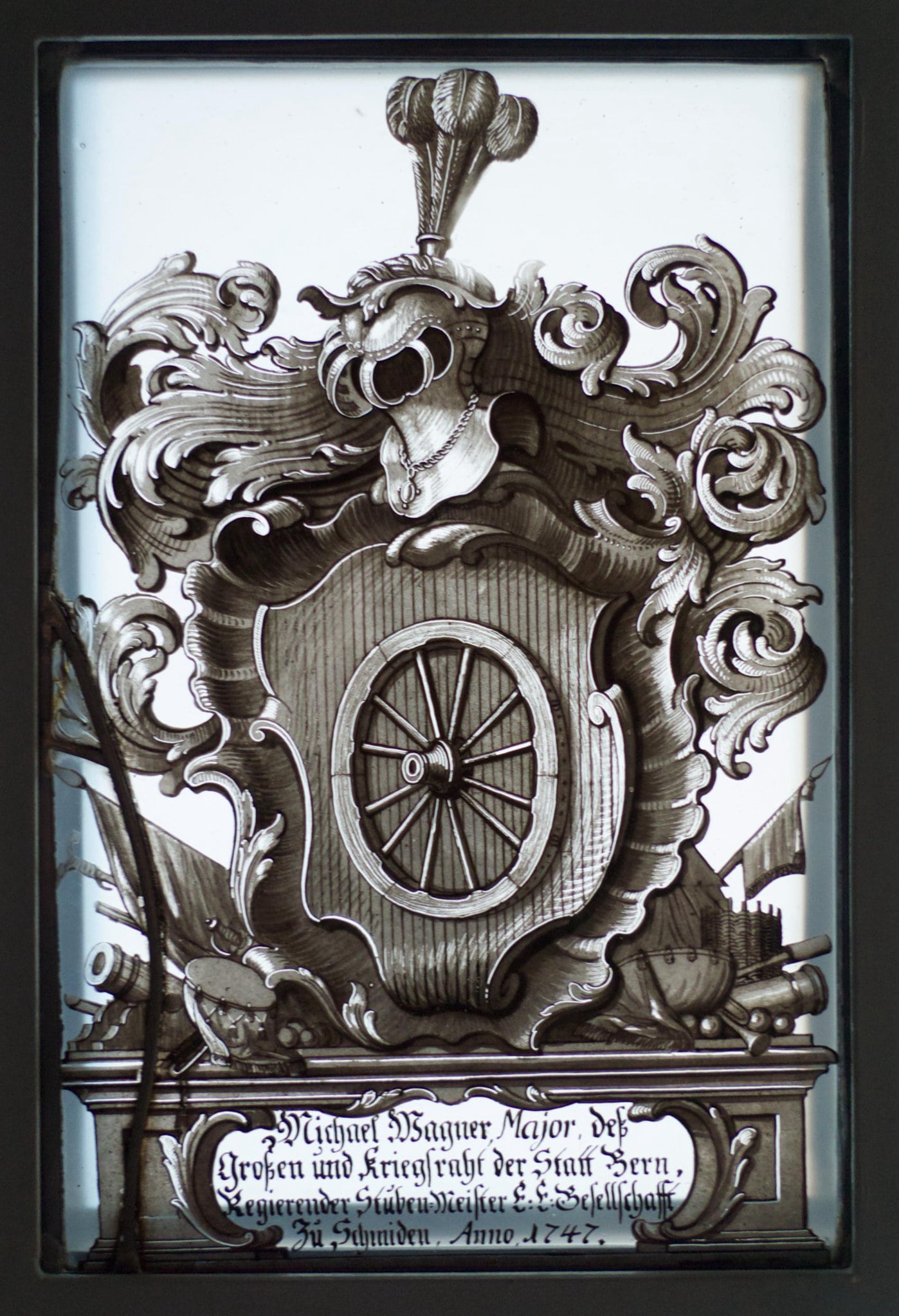 Das 1912 abgebrochene Zunfthaus der Berner Gesellschaft zu Schmieden an der Marktgasse wurde ab 1718 über Jahre grundlegend erneuert. Zu den letzten Umbauphasen zählte die 1748 erfolgte Einsetzung neuer Fenster in die vordere "façe" des Gesellschaftshauses. Dabei erbat man sich zum Schmuck der Fenster von den zur Zunft gehörenden Meisterschaften "einiche Lichter samt den Schilten". Laut Paul Wäber kamen in der Folge die Meisterschaften des Kupferschmied-, Hufschmied- und Messerschmiedhandwerks der Aufforderung nach und schenkten je ein Fenster mit ihrer "Schliffscheibe" (Wäber 1938). Bei diesen Schenkungen handelte es sich freilich nicht um Schliffscheiben, sondern um Glasgemälde in Grisaillemalerei. Unter den heute erhaltenen drei Meisterschaftsscheiben findet sich zudem keine des Messerschmiedhandwerks. Vielmehr sind es zwei Stiftungen des Huf- und Waffenschmiedhandwerks von 1739 und 1748 sowie diejenige der Kupferschmiede von 1749. Die Huf- und Waffenschmiede hatten das Gesellschaftshaus demnach bereits bei einer früheren Umbauphase mit einem Glasgemälde beehrt. Die Stiftung der Messerschmiede hingegen dürfte beim Unwetter (Hagelschlag) gegen Ende des 19. Jahrhunderts zerstört worden sein (s. u.). Ausser den drei Glasgemälden der Meisterschaften existieren aus der gleichen Periode sieben weitere Grisaillescheiben mit den Wappen von Gesellschaftsangehörigen. Nach Paul Wäber erfolgten diese Stiftungen, nachdem die Zunft, das heisst die "Committierten zu den Gesellschaftsfenstern", 1750 ein jedes "Ehrenglid" der Waisenkommission um sein Wappen für ein Fenster gebeten hatten. Von den betreffenden Scheiben datieren allerdings lediglich zwei von 1750 und 1751, die restlichen fünf jedoch aus den Jahren zwischen 1745 und 1749. Es ist deshalb davon auszugehen, dass die Zunft bereits gegen 1745 mit der Bitte um Wappengaben an einzelne ihrer Angehörigen gelangt war. Wie viele solche Gaben die Gesellschaft zu Schmieden damals in ihr erneuertes Haus erhielt, weiss man zwar nicht. Es werden aber sicher mehr als die heute noch vorhandenen zehn Glasgemälde gewesen sein.