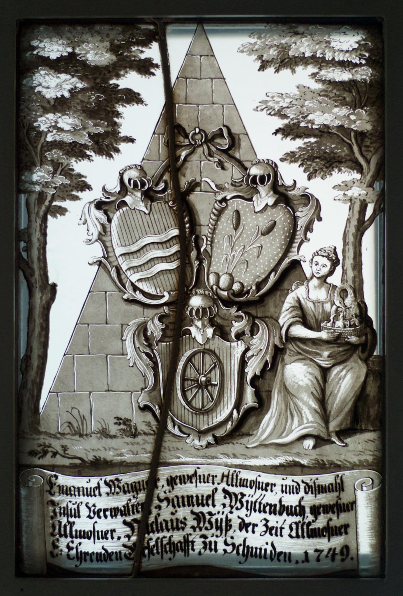 Das 1912 abgebrochene Zunfthaus der Berner Gesellschaft zu Schmieden an der Marktgasse wurde ab 1718 über Jahre grundlegend erneuert. Zu den letzten Umbauphasen zählte die 1748 erfolgte Einsetzung neuer Fenster in die vordere "façe" des Gesellschaftshauses. Dabei erbat man sich zum Schmuck der Fenster von den zur Zunft gehörenden Meisterschaften "einiche Lichter samt den Schilten". Laut Paul Wäber kamen in der Folge die Meisterschaften des Kupferschmied-, Hufschmied- und Messerschmiedhandwerks der Aufforderung nach und schenkten je ein Fenster mit ihrer "Schliffscheibe" (Wäber 1938). Bei diesen Schenkungen handelte es sich freilich nicht um Schliffscheiben, sondern um Glasgemälde in Grisaillemalerei. Unter den heute erhaltenen drei Meisterschaftsscheiben findet sich zudem keine des Messerschmiedhandwerks. Vielmehr sind es zwei Stiftungen des Huf- und Waffenschmiedhandwerks von 1739 und 1748 sowie diejenige der Kupferschmiede von 1749. Die Huf- und Waffenschmiede hatten das Gesellschaftshaus demnach bereits bei einer früheren Umbauphase mit einem Glasgemälde beehrt. Die Stiftung der Messerschmiede hingegen dürfte beim Unwetter (Hagelschlag) gegen Ende des 19. Jahrhunderts zerstört worden sein (s. u.). Ausser den drei Glasgemälden der Meisterschaften existieren aus der gleichen Periode sieben weitere Grisaillescheiben mit den Wappen von Gesellschaftsangehörigen. Nach Paul Wäber erfolgten diese Stiftungen, nachdem die Zunft, das heisst die "Committierten zu den Gesellschaftsfenstern", 1750 ein jedes "Ehrenglid" der Waisenkommission um sein Wappen für ein Fenster gebeten hatten. Von den betreffenden Scheiben datieren allerdings lediglich zwei von 1750 und 1751, die restlichen fünf jedoch aus den Jahren zwischen 1745 und 1749. Es ist deshalb davon auszugehen, dass die Zunft bereits gegen 1745 mit der Bitte um Wappengaben an einzelne ihrer Angehörigen gelangt war. Wie viele solche Gaben die Gesellschaft zu Schmieden damals in ihr erneuertes Haus erhielt, weiss man zwar nicht. Es werden aber sicher mehr als die heute noch vorhandenen zehn Glasgemälde gewesen sein.