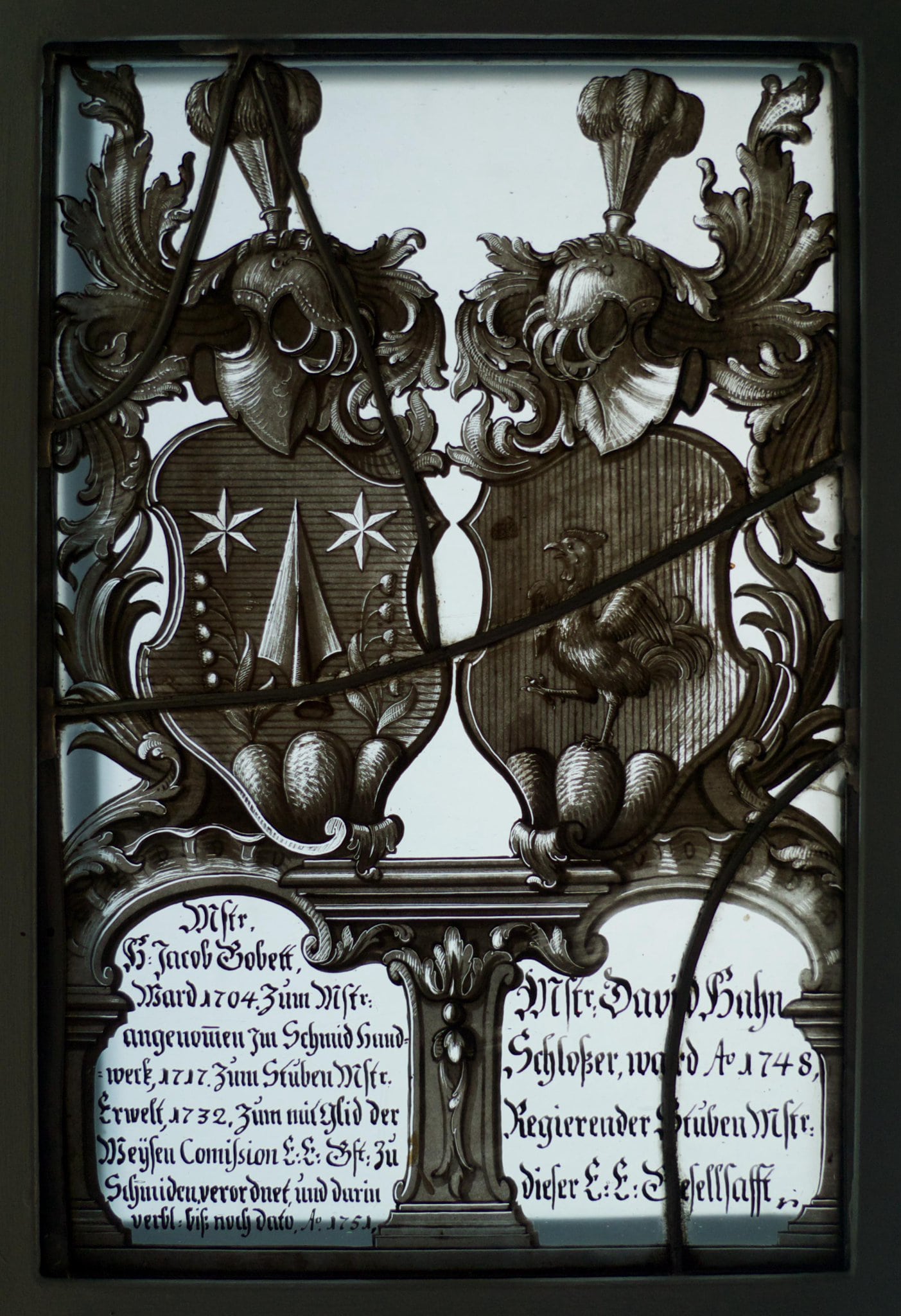 Von den zehn Grisaillescheiben ist die älteste, diejenige von 1739, eine signierte Arbeit Samuel Küpfers (1712–1786). Dass dieser auf die Anfertigung von Grisaillescheiben spezialisierte Berner Glasmaler die ganze in Glas gebrannte Wappenserie für das alte Gesellschaftshaus schuf, ist aufgrund ihrer Einheitlichkeit nicht zu bezweifeln.