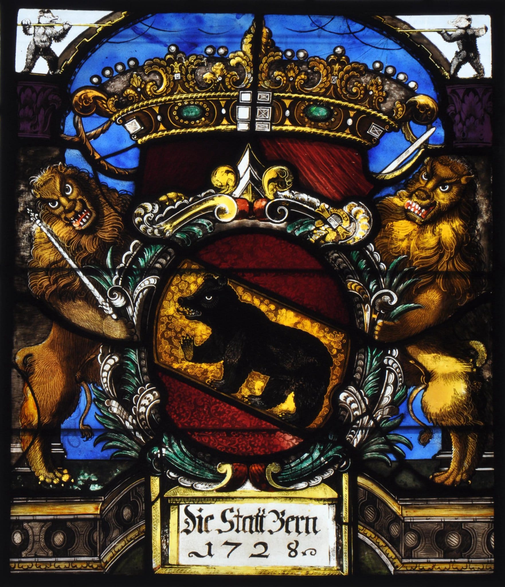 Vor blauem Grund prangt der in eine palmblattgeschmückte Rollwerkkartusche gesetzte Berner Wappenschild. Er ist von einer mit einem roten Vorhang behängten Herzogskrone als Zeichen der Landeshoheit überhöht und wird von zwei Löwen begleitet, von denen der eine ein Zepter, der andere ein Schwert mit sich führt. Die beiden Schildhalter stehen auf dem in den Farben Grau und Gelb gehaltenen Sockel, vor dessen konkavem Mittelteil das kleine Wappenpodium mit der Stifterinschrift seinen Platz hat. Dieser Sockel dient als Unterbau für die violetten Rahmenpfeiler, die einen einfach gestalteten, schlanken Flachbogen tragen. Auf ihren Kapitellen sind zwei Bären postiert, die sich mit Spiessen duellieren.