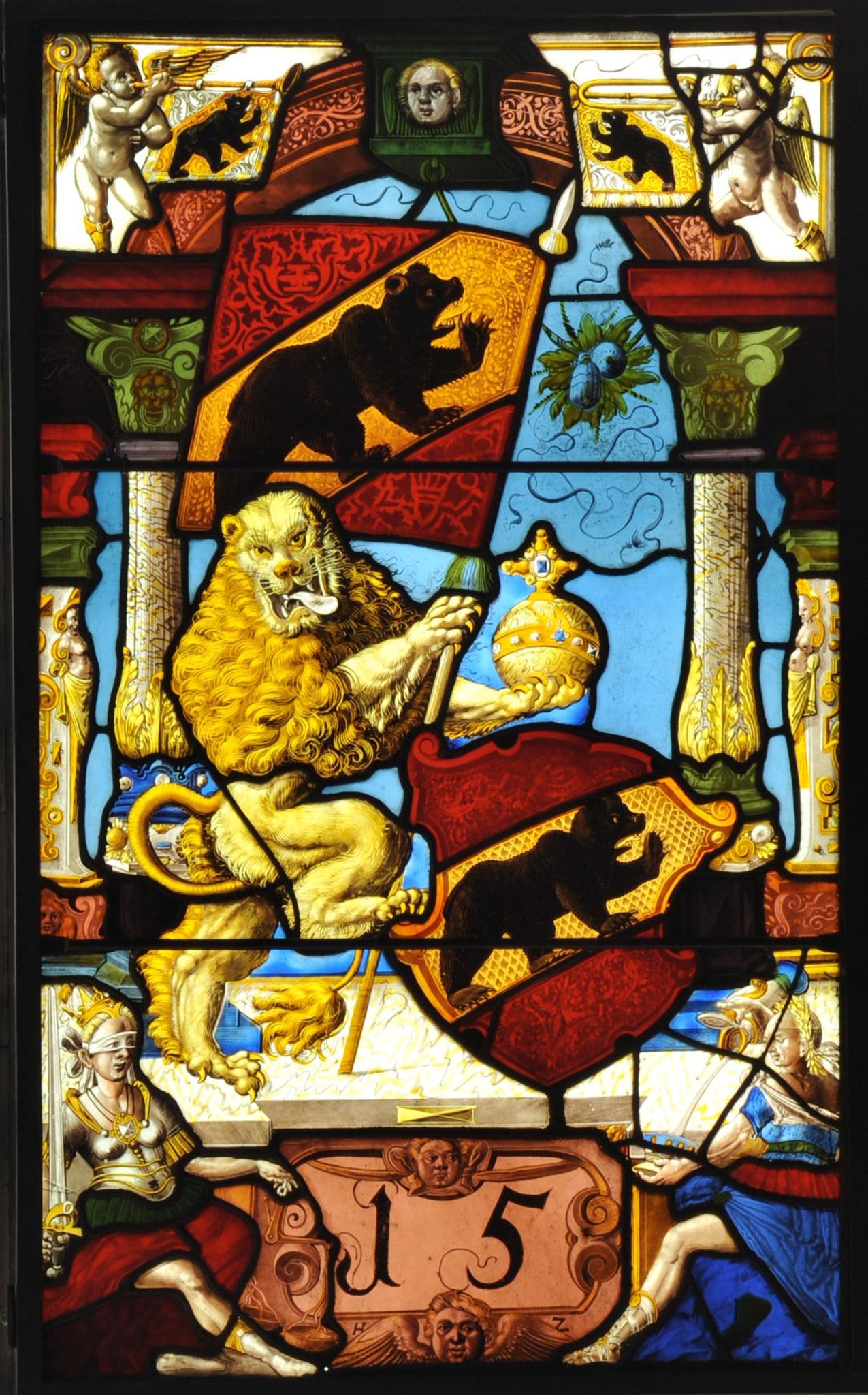 Der Berner Wappenschild ist vor hellblauem Grund auf den Sockel der rahmenden, galerieartig gebildeten Zierarchitektur gesetzt. Begleitet wird er von einem einwärts schreitenden Löwen, der das Berner Banner und den Reichsapfel in seinen Vorderpranken hält. Vor dem Sockel sitzen die allegorischen Gestalten der Gerechtigkeit (Justitia) und Mässigkeit (Temperantia). An der Sockelfront sind zwischen geflügelten Engelsköpfen die beiden ersten Ziffern des Stiftungsjahres festgehalten. Über das Banner spannt sich ein hellroter Rundbogen mit grünem, kopfgeschmücktem Scheitelstück. Er ruht auf Balustersäulen mit grünen Kapitellen. An diese Bogenrahmung schliesst sich nach aussen ein zusätzliches schmales Stützenpaar in Form von Hermenpfeilern an. Zum reichhaltigen Figurenrepertoire gehören zudem die beiden posaunenblasenden Putten in den Bogenzwickeln, deren Instrumente eine Berner Fahne ziert.
