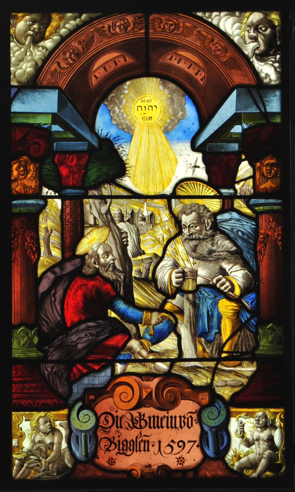 Hasler, R., Keller, S., & Bergmann, U. (2016). Gemeindescheibe Biglen mit Pflanzenbegiessung unter Gottes Segen (rechtes Stück der Doppelscheibe). Dans Vitrosearch. Consulté le 5 décembre 2025 de https://vitrosearch.ch/objects/2248031.