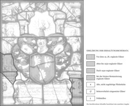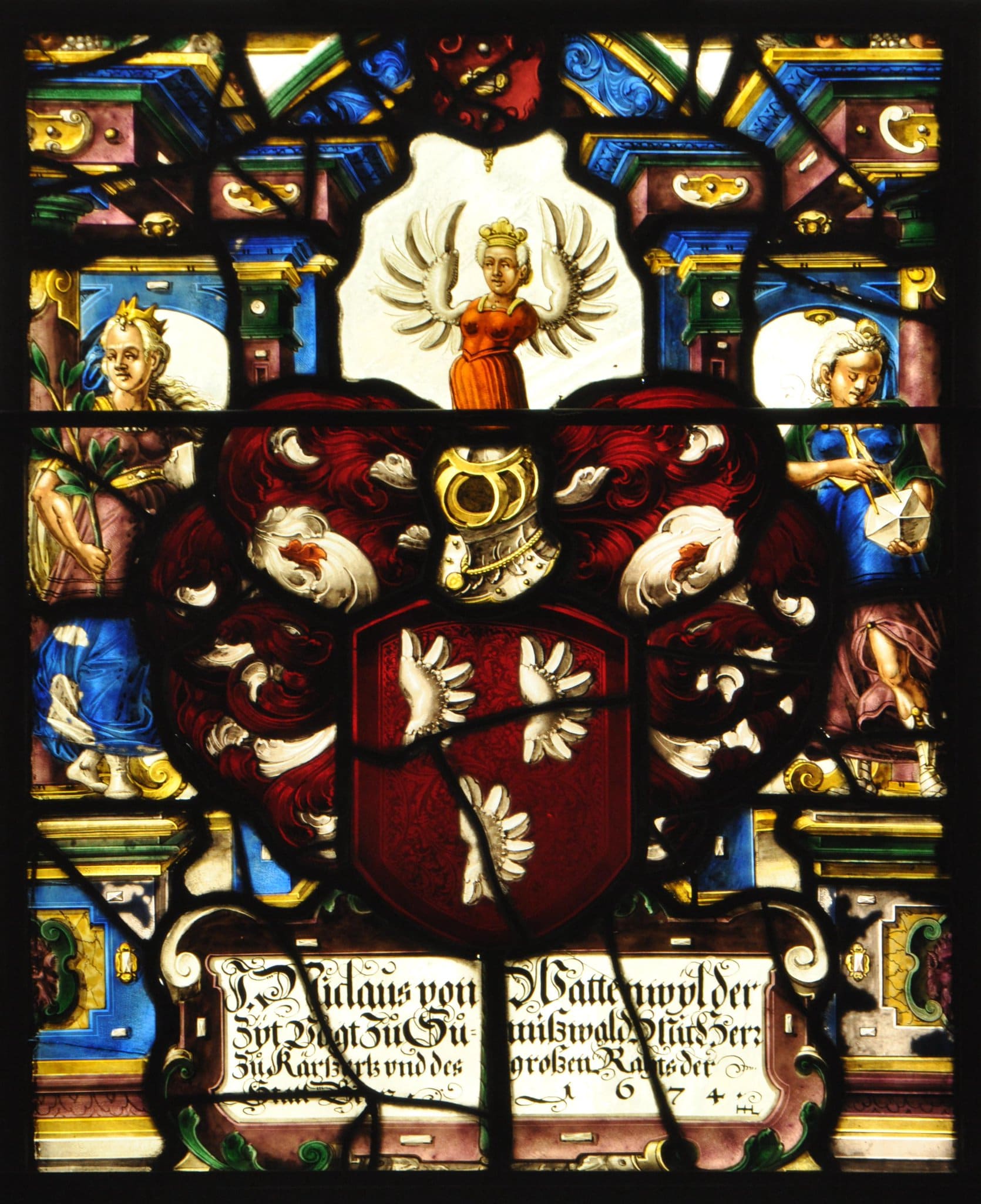 Vor farblosem Grund ist das Vollwappen des Niklaus von Wattenwyl auf die violette Rollwerkkartusche mit der Stifterinschrif gesetzt. Es befindet sich vor einer dreiachsigen Architektur aus zwei blauen Aussenarkaden mit vorgestellten violetten Säulen und Pfeilern, über denen das perspektivisch verkürzte violette Gebälk den zentralen blauen Flachbogen trägt. Vor beiden Seitenöffnungen stehen auf hohen Podesten zwei allegorische Frauengestalten in violetten und blauen Gewändern. Von ihnen hält die Gekrönte links einen Blattzweig und diejenige rechts einen Zirkel in der Hand.