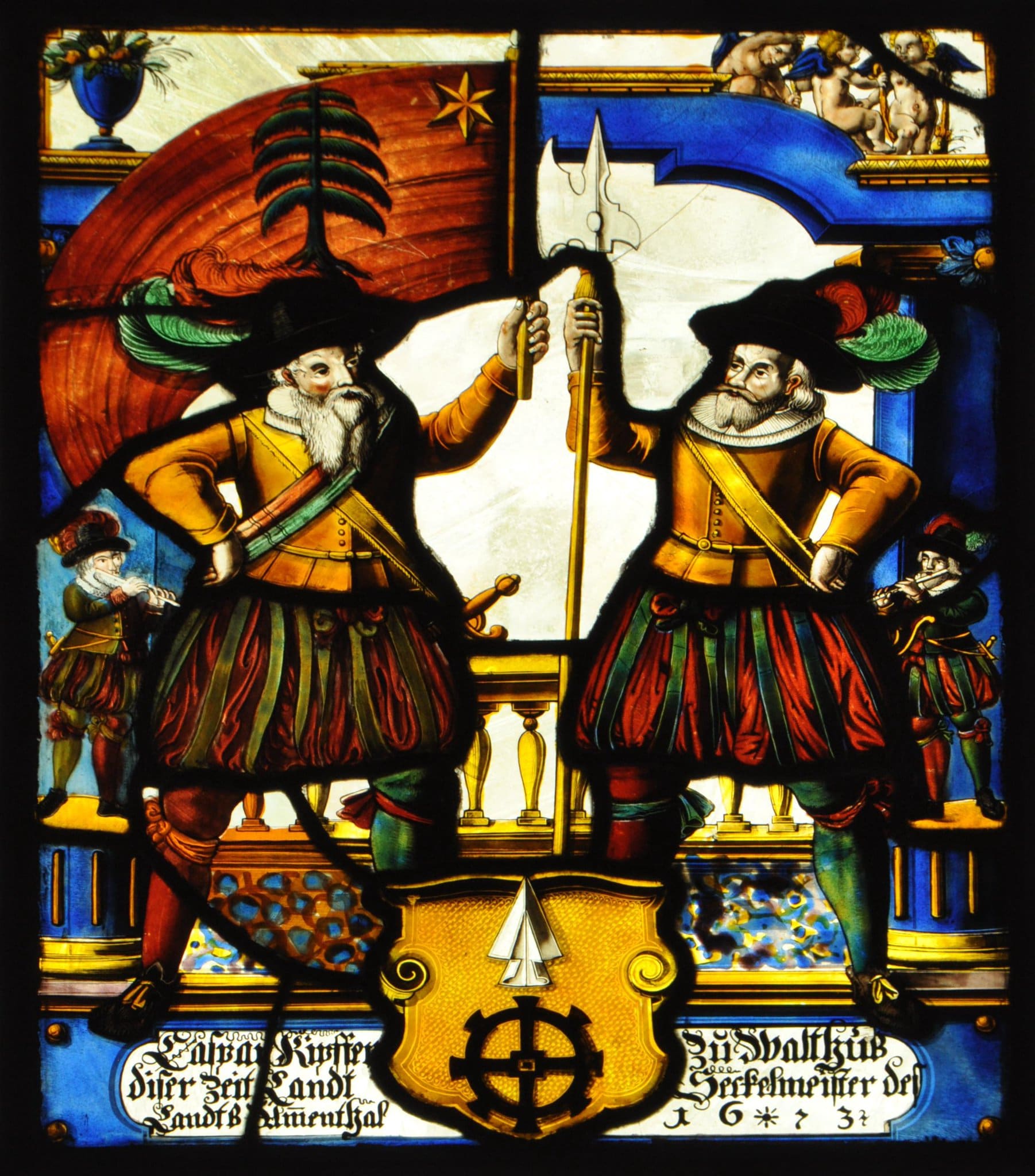 Vor dem Podium mit der Stifterinschrift und der darüber befindlichen Balustrade ist der Wappenschild Kaspar Kipfers in Begleitung eines Bannerträgers und Halbartiers dargestellt. Das vom ersteren gehaltene Banner zeigt das Wappen der Landschaft Emmental. Beide Schildwächter erscheinen in gelbem Koller, grün gestreiften, rötlichbraunen Pluderhosen und einem Schlapphut mit Federn. Vor den Pfeilern der blauen Rahmenarkade sind auf Podesten ein Pfeifer und Trommler postiert. Oben in den Ecken befinden sich auf dem Gebälk eine Fruchtvase (links) und drei Putten (rechts).