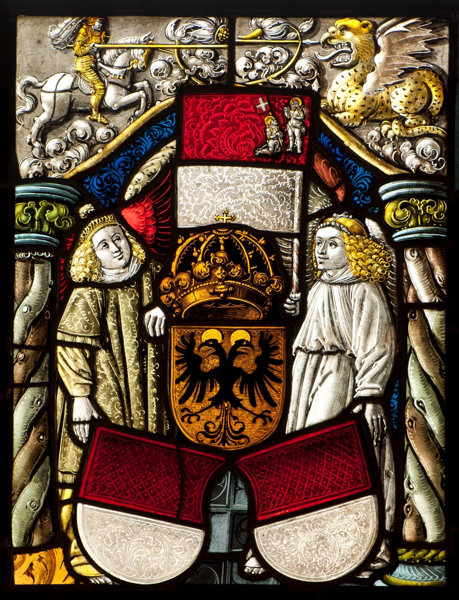 Die bekrönte Wappenpyramide Solothurn-Reich begleiten zwei vor blauem Damastgrund auf blaugrauem Fliesenboden stehende, blondgelockte Engel. Während der das Solothurner Banner haltende Engel rechts in einer Alba erscheint, trägt sein Gefährte über dieser eine damaszierte grau-gelbe Dalmatika. Im roten Feld des Banners ist der hl. Ursus kniend vor Christus dargestellt.Die Rahmung bildet ein Astwerkbogen mit verschlungenen Stämmen als Stützen. Das Oberbild in Grisaille- und Silbergelbmalerei zeigt den berittenen hl. Georg im Kampf gegen den Drachen.