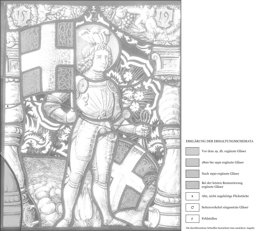 Solothurns Standespatron, der hl. Ursus, erscheint stolz posierend auf gelbem Wiesenboden vor schwarz-gelbem Damastgrund. Er ist in einen grauen Vollharnisch gekleidet und hält in der angewinkelten Rechten sein Banner sowie in der Linken an einer Fessel seinen Wappenschild mit dem durchgehenden silbernen Kreuz in Rot. Die Seitenrahmung bilden zwei fantasievolle Steinpfeiler. Über ihren Kapitellen halten zwei Putten eine bogenförmig geschwungene Girlande aus Blättern und Früchten empor. Hinter diesen Putten ist in zwei umkränzten Schilden das Stiftungsjahr festgehalten.