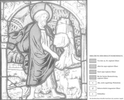 Johannes der Täufer steht vor einer bewaldeten Landschaft am Ufer eines Flusses, an dem sich eine Burg auf einem hohen pyramidenförmigen Felsenhügel befindet. Der Heilige ist in ein kamelhärenes Hemd mit einer Löwenfratze am Saum und einen leuchtend roten Mantel gekleidet. Während er in seiner Linken ein Buch hält, weist er mit der Rechten auf das mit einer Kreuzfahne ausgestattete Gotteslamm zu seinen Füssen. Die Komposition rahmt eine schlichte Arkade mit gemauertem Flachbogen, über dem Rankenwerk die Zwickel füllt.