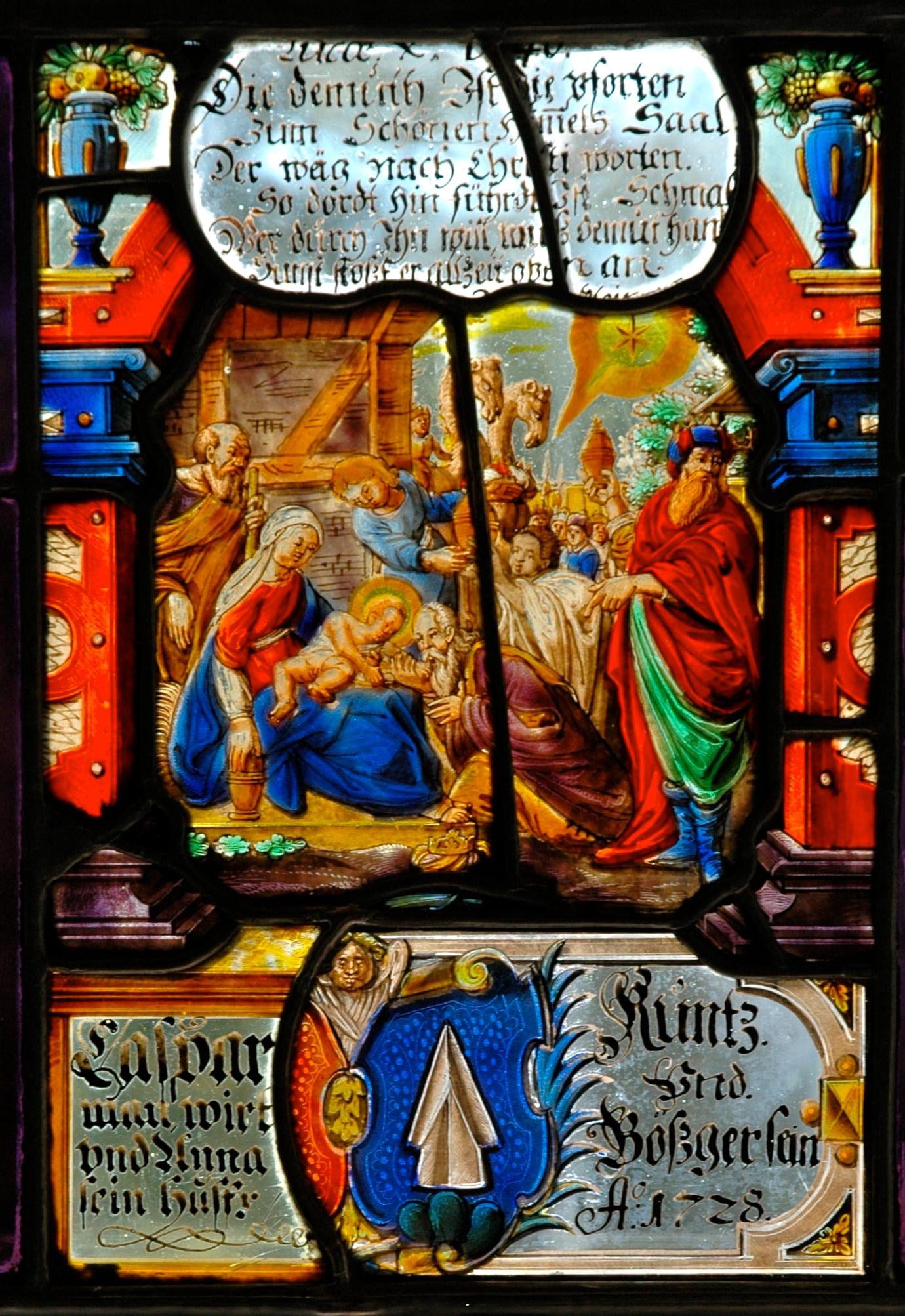 Das Glasgemälde schildert die Anbetung des Christkindes durch die seit dem 6. Jahrhundert als Caspar, Melchior und Balthasar bezeichneten drei Magier aus dem Morgenland. Diese werden von der von Joseph begleiteten, in ein rotes Gewand und einen blauen Mantel gehüllten Gottesmutter empfangen, die mit dem Jesuskind auf ihrem Schoss vor dem Stall am Boden sitzt. Von den drei Königen hat sich der Älteste in seinem violetten Mantel niedergekniet, um die Hand des Neugeborenen zu ergreifen. Dahinter erscheinen seine beiden Gefährten mit ihren Gaben sowie ganz im Hintergrund unter dem Stern Bethlehems der königliche Zug mit seinen Kamelen. Das Figurenbild rahmt eine Arkade aus einem roten Bogen und roten Pfeilern mit blauen Kapitellen und violetten Basen. Auf den Bogenansätzen stehen zwei blaue Vasen mit Fruchtbouquets. Die Stifterinschrift am Scheibenfuss ist nur noch fragmentarisch erhalten (s. u.).