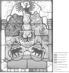 Vor blauem Grund steht die von zwei Löwen gehaltene Wappenpyramide Bern-Reich. Ihr oberer Abschluss bildet der auf dem bekrönten Wappenhelm sitzende Reichsadler mit dem Reichsapfel in der Kralle. Darüber schwingt sich ein zierlicher Astbogen mit Blattwerk. Dieser ruht auf den roten Kapitellen der die Seitenrahmung bildenden schlanken Säulen. Auf den Kapitellen stehen zwei Bären, die mit Pfeife bzw. Trommel musizieren. Die Säulenbasen in den unteren Ecken schmücken Löwenmasken. Der grüne Teppich unterhalb der Bernschilde ist erneuert.
