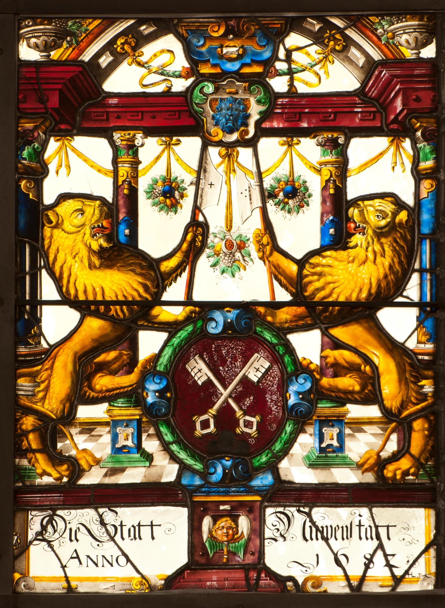 Das Stadtwappen Neuenstadts wird von einem mit blauen Rollwerkagraffen belegten grünen Lorbeerkranz umfasst. Es steht auf dem rosa Sockel, der mit einem geflügelten Engelskopf dekoriert und dem Podium mit der Stifterinschrift zentral vorgesetzt ist. Als Schildbegleiter fungieren zwei auf dem grau und weiss gefliesten Boden des Podiums postierte Löwen. In einer ihrer Vorderpranken halten sie je eine Halbarte. Dahinter erheben sich vor farblosem Grund vier Säulen. Sie tragen ein dunkelrotes Gebälk, das eine Kartusche mit Löwenmaske schmückt. Darauf ruht ein Flachbogen. Diesem sind seitlich auf den vorgelagerten Architravteilen Schalen mit Fruchtbouquets vorgesetzt. Weitere Fruchtbouquets sind an den vom Gebälk herabhängenden gelben Stoffbändern festgemacht.